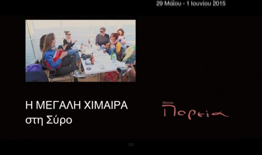 Το μαγικό ταξίδι της “Μεγάλης Χίμαιρας” στη Σύρο καταγράφεται σε ένα συλλεκτικό βίντεο με τις σημαντικότερες στιγμές της επιτυχημένης παραγωγής του Θεάτρου Πορεία από την προετοιμασία των ηθοποιών και της σκηνής, μέχρι τη μεγάλη πρεμιέρα και το αποθεωτικό χειροκρότημα του κοινού.