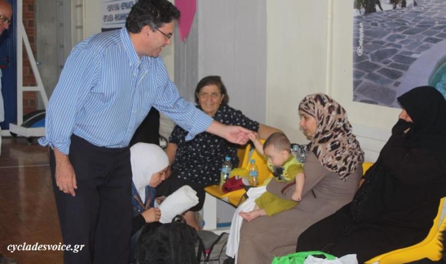 Το Κλειστό Γυμναστήριο επισκέφτηκε και ο δήμαρχος Νάξου και Μικρών Κυκλάδων, κ. Μανόλης Μαργαρίτης, συνοδεία του αντιδημάρχου κ. Τοτόμη Πρωτονοτάριου, οι οποίοι συνομίλησαν με εκπροσώπους των Αρχών και εθελοντές, οι οποίοι παρακολουθούν από κοντά το ζήτημα, αλλά και με τους ίδιους τους πρόσφυγες, εκφράζοντας την συμπαράστασή τους στις δύσκολες αυτές στιγμές.