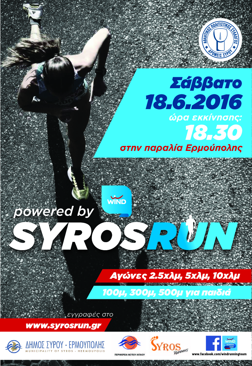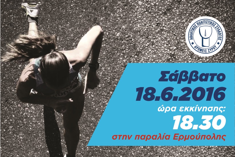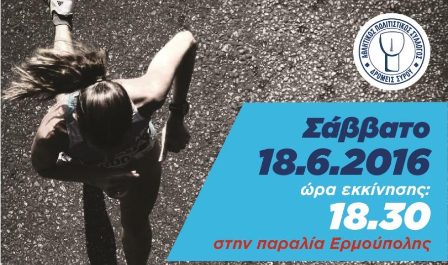 Όλα είναι έτοιμα για το μεγαλύτερο δρομικό αθλητικό γεγονός της Σύρου. Πλήθος αθλητών συριανών, από όλη την Ελλάδα και το εξωτερικό θα συμμετάσχουν στους αγώνες δρόμου το απόγευμα του Σαββάτου 18-6-2016. Οι συμμετέχοντες θα διατρέξουν διαδρομές των 100μ, 300μ, 500μ για παιδιά και 2,5 χλμ., 5χλμ. και 10 χλμ. για μεγάλους.