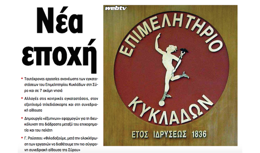 Σε μια νέα εποχή εισέρχεται το Επιμελητήριο Κυκλάδων, καθώς εκσυγχρονίζεται και ανανεώνεται, τόσο σε επίπεδο υποδομών, όσο και σε επίπεδο προσφερόμενων φυσικών και ψηφιακών υπηρεσιών, προς όφελος των νησιωτικών επιχειρήσεων μελών του, των επισκεπτών, αλλά και της Σύρου, ειδικότερα, με τη στήριξη του συνεδριακού τουρισμού, μέσω των εγκαταστάσεών του.