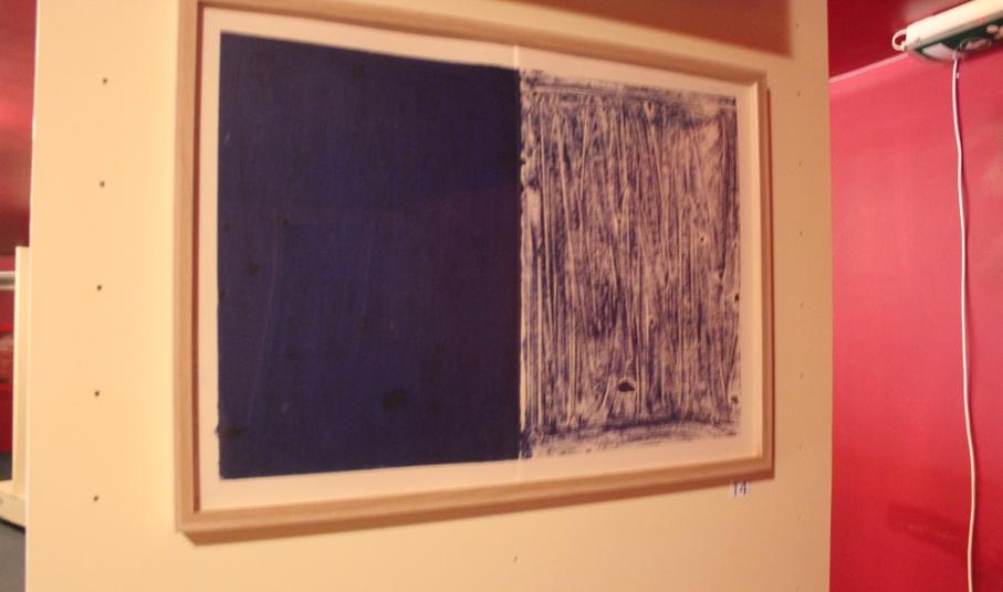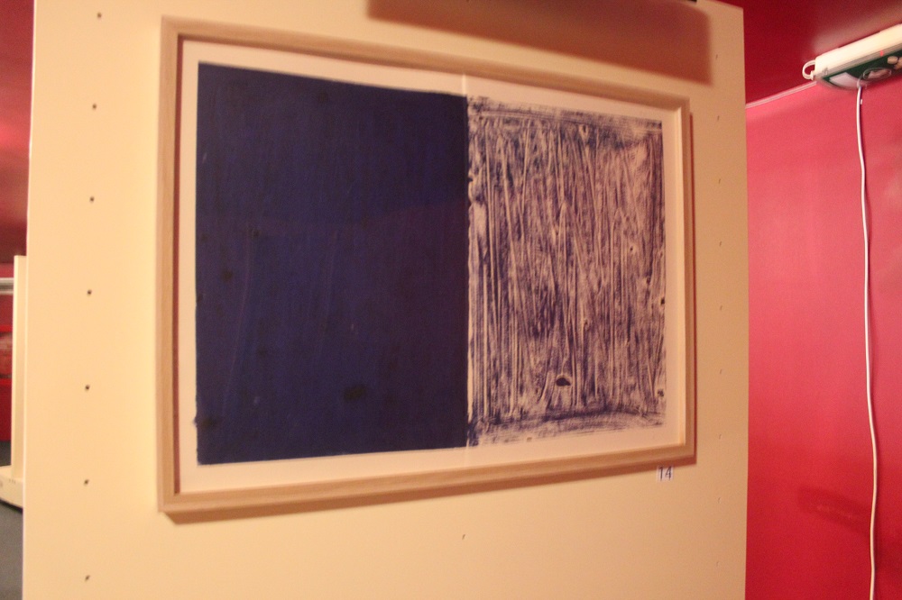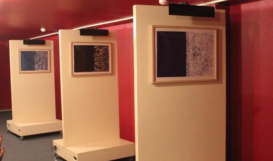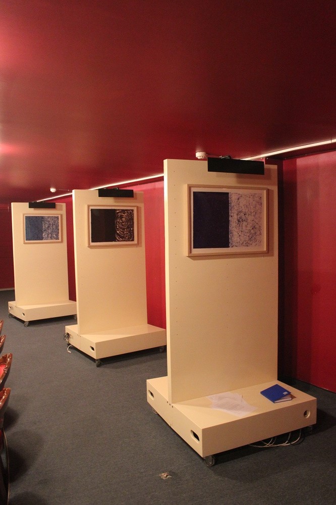 Δεκατέσσερις μπλε πίνακες ζωγραφικής (50 cm x 70 cm) σε άσπρο χαρτί εκτίθενται στα υπάρχοντα σταντ του τρίτου ορόφου.