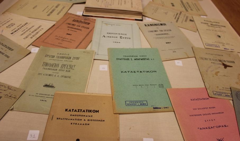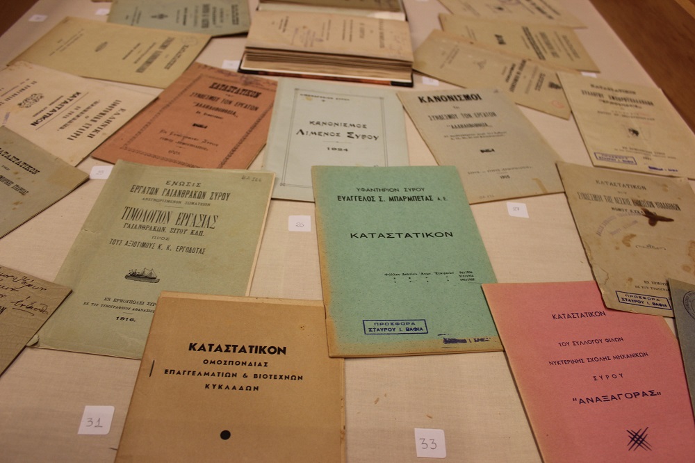 Αξίζει να υπογραμμιστεί ότι τα έντυπα που τυπώθηκαν στη Σύρο το 19ο αιώνα ξεπερνούν τα 1500. Για την πραγματοποίηση της έκθεσης, αντλήθηκε υλικό από τη Δημοτική Βιβλιοθήκη, το Ιστορικό Αρχείο, όπου φυλάσσεται η πλούσια συλλογή του Σταύρου Βαφία και του Ανδρέα Δρακάκη, από τη Βιβλιοθήκη του Γυμνασίου και το Σύλλογο των Εμποροϋπαλλήλων. Σημαντική ήταν επίσης η συμβολή του στιχουργού, ποιητή και συγγραφέα Μάνου Ελευθερίου, ο οποίος διέθεσε περίπου 30 Συριανά έντυπα εκ των 250 που φυλά στο προσωπικό αρχείο του, καθώς και του δημοτικού συμβούλου Δομένικου Σαγκινέτου. Οι δύο αυτές συλλογές εκθέτονται ξεχωριστά.