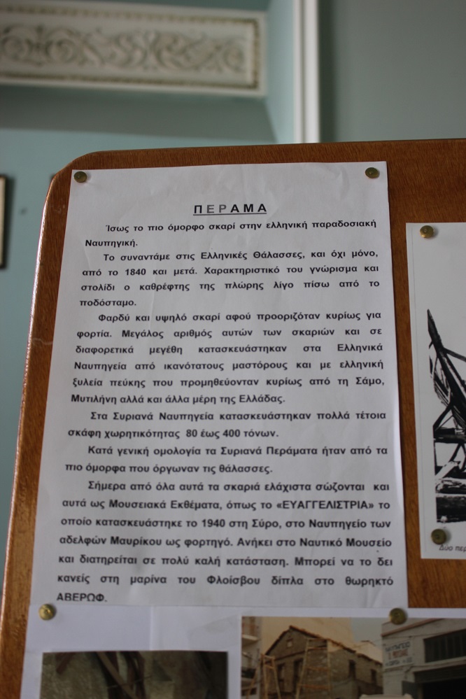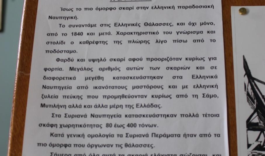 Πρόκειται για ένα μικρό έκθεμα (μοντέλο) αφιερωμένο στη ναυπηγική ιστορία της Σύρου και κυρίως στην τέχνη του καραβομαραγκού, που άνθισε κατά το παρελθόν στο νησί, καθιστώντας το, κέντρο της Μεσογείου με φόντο τη σπουδαία δραστηριότητα που αναπτύχθηκε.