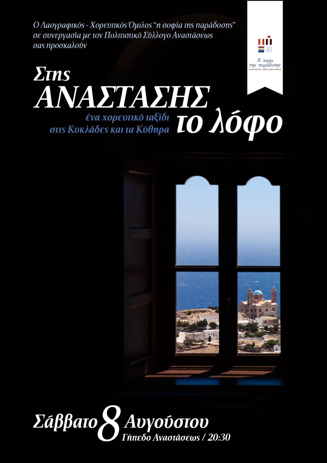 Ο κύκλος των παράλληλων εκδηλώσεων για αυτό το σαββατοκύριακο ολοκληρώνεται με την εκδήλωση «Στης Ανάστασης το λόφο», ένα χορευτικό ταξίδι στις Κυκλάδες και τα Κύθηρα, που διοργανώνει στο λόφο της Ανάστασης (γήπεδο μπάσκετ) ο Λαογραφικός - Χορευτικός Όμιλος "η σοφία της παράδοσης" σε συνεργασία με το Πολιτιστικό Σύλλογο Αναστάσεως.