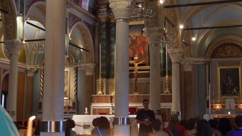 “Απαιτήθηκε χρόνος διότι εν τω μεταξύ αποκαλύφθηκαν και στοιχεία τα οποία δεν μπορούσαμε να τα προβλέψουμε και δεν τα γνώριζε κανένας. Αυτός όλος ο εσωτερικός διάκοσμος είναι ένας διάκοσμος που είχε δημιουργηθεί από κάποιον Ιταλό λεπτουργό, τον Vianello Giuseppe. Προσπαθήσαμε από την αρχή να αποκαταστήσουμε το συγκρότημα και κυρίως τον Ναό στην αρχική μορφή του. Ακριβώς επειδή είχαμε ένα θέμα χρηματοδότησης το είχαμε μοιράσει σε επτά τμήματα το Εκκλησιαστικό Συγκρότημα: Τον Ναό, τον πρόναο που έπρεπε να αποκατασταθεί γιατί είχε κλείσει, το Βαπτιστήριο, το οποίο είναι και το αρχαιότερο στοιχείο ολόκληρου του Συγκροτήματος (1703), το εσωτερικό, η Σχολή, το καμπαναριό, το Επισκοπικό Μέγαρο και τέλος, μία ερειπωμένη κατοικία. Το τελευταίο τμήμα, εντάχθηκε στον προϋπολογισμό ώστε να γίνει ένα Κέντρο Έρευνας της Καθολικής Εκκλησίας επάνω στα θέματα του Συριανού Πολιτισμού”.