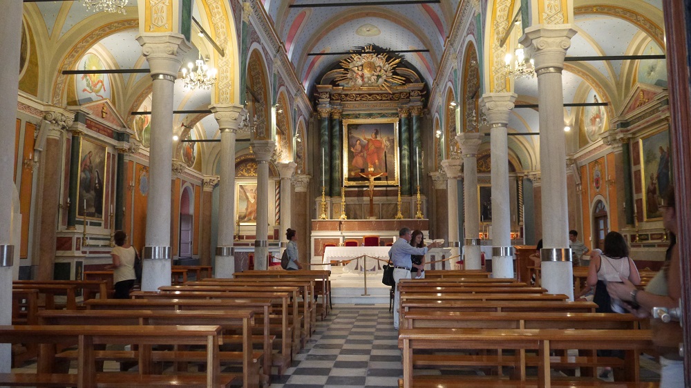“Δώσαμε έμφαση στο να αποκατασταθεί η αρχική μορφή και η λειτουργία που είχε το Συγκρότημα. Ο Ναός είχε υποστεί πάρα πολλές αλλοιώσεις στην πορεία του, από το 1834 και μετά. Παραδείγματος χάριν το καμπαναριό είχε χτυπηθεί τέσσερις φορές από κεραυνούς και το 1895 το είχαν κατεβάσει και το έχτισαν με μονά τόξα, - όχι όπως είναι τώρα και όπως ήταν στην αρχή – αλλά και με έναν όροφο λιγότερο, κάτι που έκανε τον Ναό να έχει μία εικόνα αντιαισθητική. Σήμερα πλέον, έχουμε ένα πολύ όμορφο καμπαναριό, υπέροχο και μαρμάρινο όπως το σχεδίασε αρχικά ο αρχιτέκτων. Στη συνέχεια, είχαμε πρόγραμμα να ανοίξουμε τα τόξα του πρόναου, ο οποίος ήταν κλειστός και υπήρχε μόνο μία πόρτα κι έμοιαζε με αποθήκη. Πάνω από εκεί φαινόταν ένα ντεπόζιτο νερού. Μία άλλη σοβαρή αποκατάσταση ήταν του ερειπίου που προαναφέραμε, το οποίο είναι ένα κόσμημα για την περιοχή. Αυτά ήταν τα βασικά μας μελήματα. Δεν γνωρίζαμε τί πλούτο έφερε ο διάκοσμος μέσα στον Ναό. Όταν αποκαλύφθηκε μετά τις πρώτες εργασίες των συντηρητών, το ίδιο το Υπουργείο Πολιτισμού ενδιαφέρθηκε έντονα και οι ίδιοι μελέτησαν την παρακάτω πορεία της συντήρησης του εσωτερικού διακόσμου και καταφέραμε και πήραμε μία μικρή επέκταση του αντικειμένου από το ΕΣΠΑ με 300.000 ευρώ ακόμη για να μπορέσουμε να τον αποκαλύψουμε. Όπως μπορεί να δει ο επισκέπτης είναι ο αρχικός διάκοσμος, με τα εμβλήματα των Επισκόπων, καθώς αυτά ήταν χαρακτηριστικά του ποιός ήταν ο στόχος του καθενός. (...). Ο Ναός έχει θησαυρούς που δεν τους είχαμε αξιοποιήσει. Παραδείγματος χάριν οι πίνακες στα τέμπλα είναι ιδιαιτέρως αξιόλογοι καθώς ανήκουν σε γνωστό ζωγράφο. Η “Καρδία του Ιησού” είναι του Γκαλιάρντι, ενός μεγάλου ζωγράφου του 19ου αιώνα που είχε έρθει για να διακοσμήσει τον Άγιο Διονύσιο στην Αθήνα κι έφτιαξε κι αυτούς τους πίνακες. (...). Επίσης η “Παναγία του Ροδαρίου” έχει ιδιαίτερη αξία. (...). Ανακαλύψαμε επίσης, την κορυφή της πυραμίδας επάνω στην οποία εδράζεται ο Ναός. Εκεί λοιπόν, σε αυτήν την πυραμίδα που είναι 188, 16 μέτρα από τη θάλασσα όταν κανείς φθάνει, αναλογίζεται που βρίσκεται. Εκείνο που έχει ενδιαφέρον είναι ότι ο ιστορικός της Σύρας, ο Αμπελάς γράφει κάτι πολύ χαρακτηριστικό: “Ίσταται επί της κορυφής του λόφου ως η κιβωτός επί του Αραράτ. Κι αν δεν υπήρχε αυτή η κιβωτός η ιστορία της νήσου Σύρου ολόκληρη, από των αρχαιοτάτων χρόνων μέχρι τα καθ΄ ημάς, θα είχε εξαφανισθεί”. Και είναι γεγονός καθώς σε αυτό εδώ το μέρος φυλάσσονταν και τα Αρχεία. Όταν κάηκαν τα Αρχεία το 1617, κάηκαν όλα. Κάηκε και το Επισκοπικό Μέγαρο. Έκτοτε όμως υπάρχουν τα πάντα. Έχω βρει το γενεαλογικό δέντρο μου από το 1740 και μάλιστα πριν ψηφιοποιηθεί το Αρχείο. Έως και το 1617 βρίσκει κανείς τις συνέχειες των οικογενειών και τί είχε συμβεί μέχρι τότε. (...)”.
