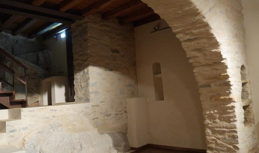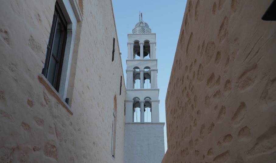 “Το έργο ολοκληρώθηκε τώρα, ουσιαστικά τρία χρόνια μετά από τον Φεβρουάριο του 2012, οπότε και ξεκίνησε η εργολαβία να αποκαθιστά και να συντηρεί το Εκκλησιαστικό Συγκρότημα. Οι μελέτες και η προεργασία είχαν ξεκινήσει από το 2003. Ο τότε Επίσκοπος μου είπε ότι ο Ναός κατέρρεε κι έπρεπε κάτι να κάνουμε. Ξεκινήσαμε τότε και κάναμε αποτύπωση. Έφερα κάποιους σπουδαστές μου, στη συνέχεια κάναμε τη μελέτη, κάναμε λεπτομερή έρευνα όλης της ιστορίας του Ναού, αλλά συνολικά για ό,τι είχε γίνει εδώ, καθώς αυτός είναι ο πέμπτος Ναός που χτίστηκε από το 1832 μέχρι το 1834, οπότε κι έγιναν τα εγκαίνιά του. Προσπαθήσαμε να βρούμε χρηματοδότες. Πλησιάσαμε το Ίδρυμα Νιάρχου. Μας είπαν ότι δέχονται αλλά έπρεπε να έχουμε έτοιμες άδειες. Έως ότου να βγάλουμε τις άδειες πέρασαν δύο, τρία χρόνια. Όταν οι άδειες ήταν έτοιμες το Ίδρυμα Νιάρχου είχε δεσμευθεί σε άλλα μεγάλα έργα κι επομένως ήμασταν στον αέρα. Εκείνη τη στιγμή βοήθησε πολύ ο ίδιος ο Άγιος Γεώργιος. “Έριξε” έναν κεραυνό, χτυπήθηκε το καμπαναριό και συγκλονίστηκε ολόκληρο το νησί, καθώς χάλασε ένα από τα δύο κοσμήματα των λόφων. Καταφέραμε λοιπόν και περάσαμε το έργο στο ΕΣΠΑ. Φορέας χρηματοδότησης του έργου, ύψους 3 εκατ. Ευρώ συνολικά είναι η Διαχειριστική Αρχή και φορέας εκτέλεσης του έργου ανέλαβε το ίδιο το Υπουργείο Πολιτισμού, το οποίο και το παρακολούθησε με τους επιβλέποντές του. Τελικά, ξεκίνησε το έργο τον Φεβρουάριο του 2012. Είχαμε μία καθυστέρηση αρκετά σημαντική διότι είχαμε ένα θέμα για το πώς θα περνούσε ο γερανός και τα τόσο μεγάλα γερανοφόρα προκειμένου να εγκατασταθούν εδώ. Τελικά επιλύθηκε κι αυτό και ξεκίνησαν οι εργασίες από το καλοκαίρι και μετά”.