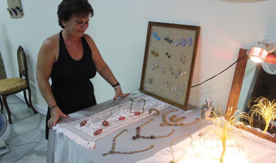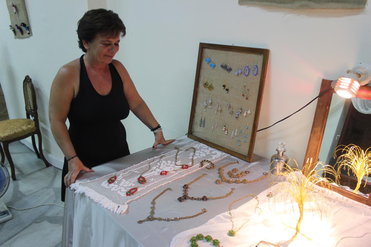 Με βασικό υλικό το κρύσταλλο, τα σκουλαρίκια, τα μενταγιόν και τα βραχιόλια της κ. Κοσμά είναι αποτέλεσμα μιας πολυετούς ενασχόλησης με το αντικείμενο, το οποίο μοιράζεται για πρώτη φορά με το φιλότεχνο κοινό. Στην έκθεση περιλαμβάνονται ακόμα πλεκτά και βραχιολάκια με μακραμέ, δεντράκια από αλπακά και κρύσταλλο, καθώς και πολλά ακόμα αντικείμενα, ρετρό αισθητικής.