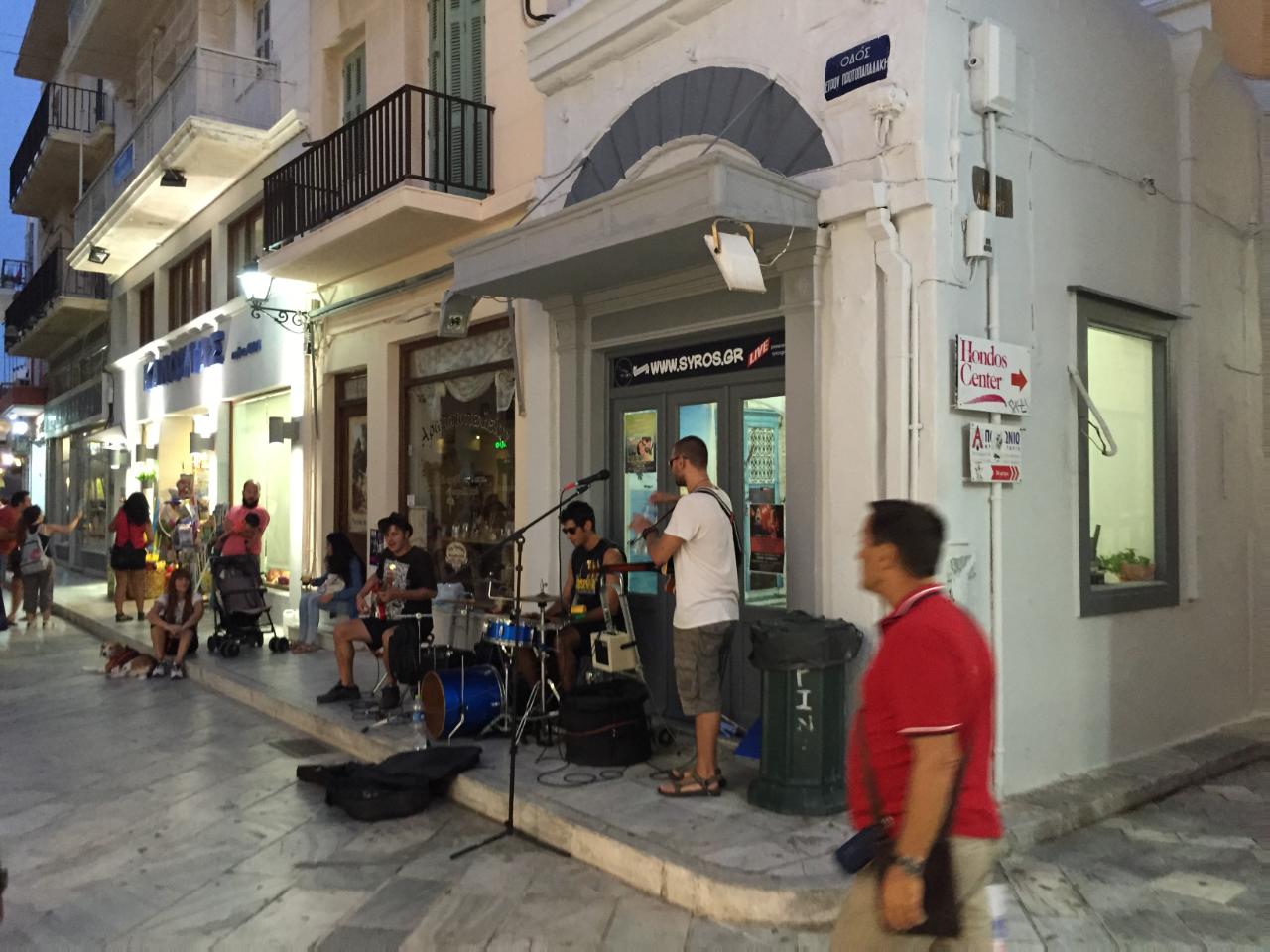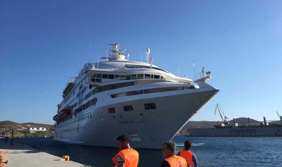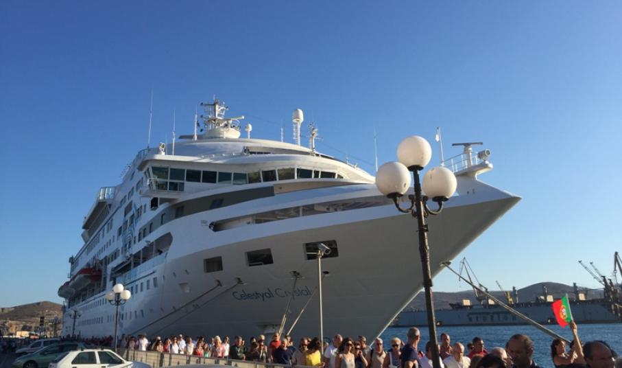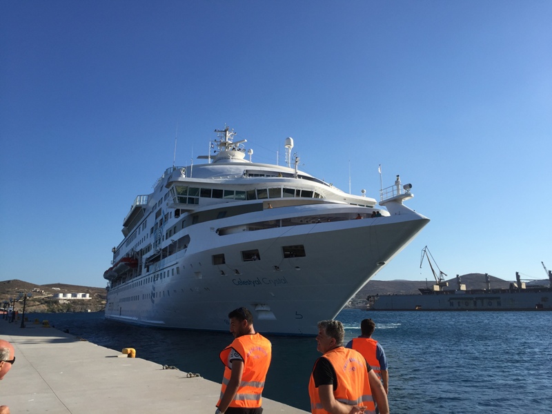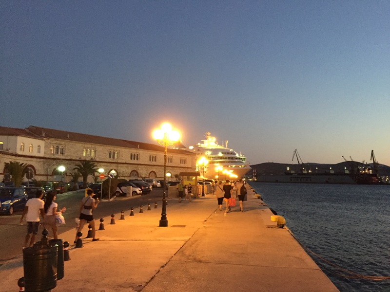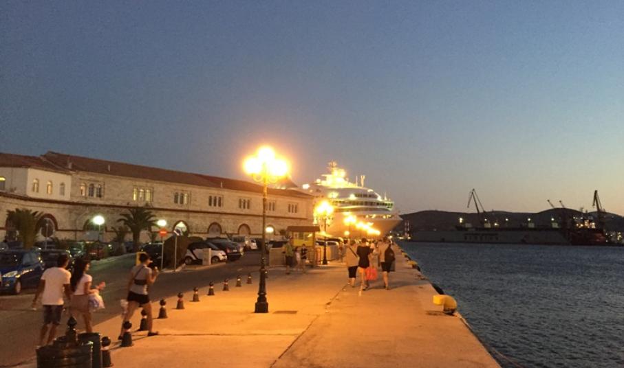 Επιστρέφω από το απογευματινό μπάνιο στο Δελφίνι. Κατηφορίζοντας από τα Τάλαντα βλέπω να μπαίνει ένα λευκό κρουαζιερόπλοιο στο λιμάνι. Μου έρχεται η έμπνευση και επιθυμία ταυτόχρονα, παρά την πείνα μου, να πάω στο λιμάνι και να παρακολουθήσω την διαδικασία προσέγγισης και το δέσιμο στην προβλήτα. Είναι 18:30 και έχει δυνατό αέρα. Οι χειρισμοί από το πλοίο και την στεριά γίνονται άψογα και σε λίγη ώρα είναι όλα έτοιμα για να αρχίσει η αποβίβαση στην Ερμούπολη. Έρχεται μάλιστα και ένα πούλμαν για να παραλάβει κάποιους επιβάτες που ενδεχομένως ήθελαν να περιηγηθούν κάποιες πιο μακρινές περιοχές του νησιού και όχι να περπατήσουν μέσα στην Ερμούπολη, η οποία την ώρα εκείνη του καλοκαιρινού απογεύματος είναι μαγική , σκέτος πίνακας ζωγραφικής.