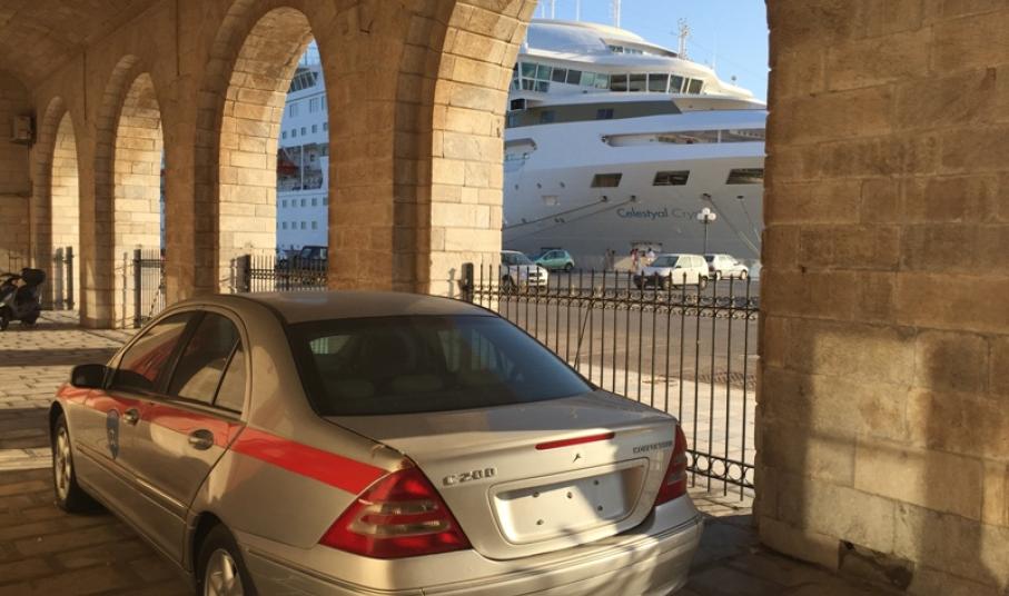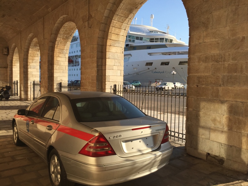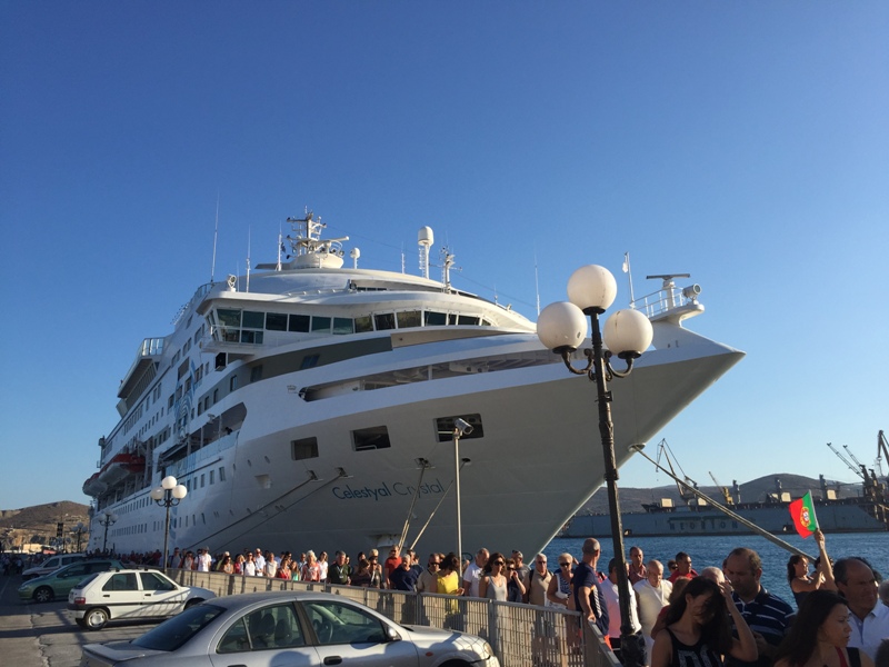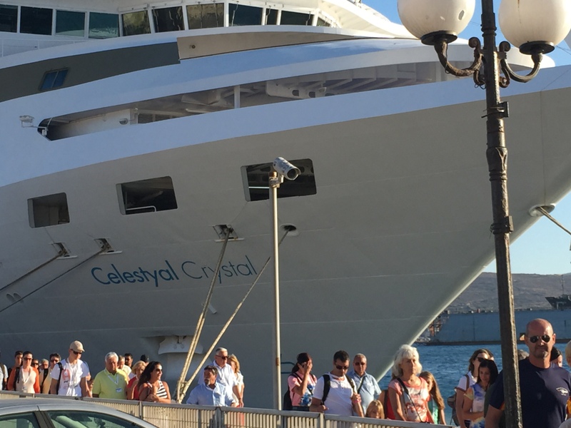 ( Χημείο , Τελωνείο προς τι; Πολεοδομία;). Αμέσως φαίνεται η μεγάλη αντίθεση στην αντιμετώπιση των επιβατών αυτών. Το κρουαζιερόπλοιο άψογα οργανωμένο, παρατηρώ ότι βγάζει ακόμα και κόκκινο χαλί πάνω στην τσιμεντένια προβλήτα για να προδιαθέσει ευχάριστα τους επιβάτες για τον προορισμό τους. Η πόλη από την άλλη απαθής, αδιάφορη, απούσα. Ούτε ένας επίσημος , δήμαρχος, αντιδήμαρχος , δημοτικός σύμβουλος, λιμενάρχης , ένστολος , άφαντοι.
