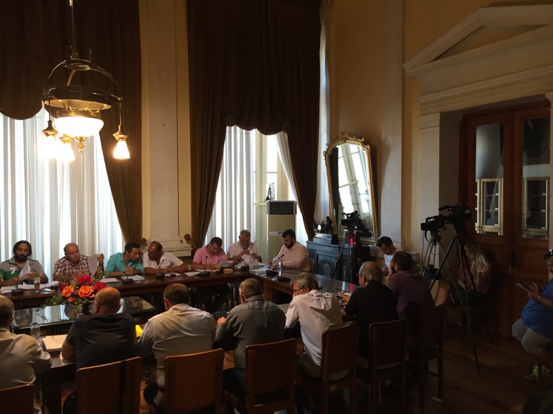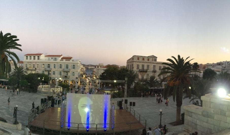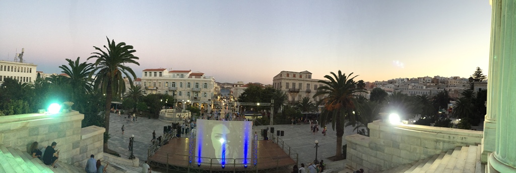 Αποφασίζω να ακολουθήσω τους επιβάτες , προκειμένου να δω που κατευθύνονται μέσα στην Ερμούπολη και πως αξιοποιούν τον χρόνο παραμονής τους . Φθάνω στην πλατεία Μιαούλη του Δημαρχείου. Εκεί στήνουν την εξέδρα για μια μουσική παράσταση και ήδη κάνουν δοκιμές στον ήχο και την τεράστια οθόνη για προβολή. Το σκηνικό είναι ευχάριστο , γιορτινό , προμηνύει μια ζωντανή βραδιά . Ανεβαίνω τα σκαλιά του Δημαρχείου που είναι ανοιχτό. Χάρηκα. Λέω κοίτα να δεις μάλλον είναι ανοιχτό για τους επισκέπτες του νησιού αλλά και του κρουαζιερόπλοιου που πριν λίγο ήρθε και ξαμόλησε εκατοντάδες ορεξάτους επιβάτες. Ανεβαίνω τα σκαλιά προς τον όροφο της Αίθουσας Δημοτικού Συμβουλίου. Η ιστορική Αίθουσα είναι ανοικτή. Δεύτερη ευχάριστη έκπληξη για μένα. Τότε όμως βλέπω ότι μέσα στην αίθουσα συνεδριάζει το Δημοτικό Συμβούλιο και παθαίνω σοκ ! Τώρα βρήκαν να συνεδριάσουν οι αθεόφοβοι. Τώρα η Ιστορική Αίθουσα , αξιοθέατο που εγώ , ο άσχετος, φροντίζω να οδηγήσω όλους τους φίλους που μας επισκέπτονται στο νησί, τώρα θα έπρεπε να είναι προσβάσιμη και μάλιστα με ανθρώπους της πόλης πρόθυμους να εξηγήσουν την ιστορία της Αίθουσας και του κτιρίου.