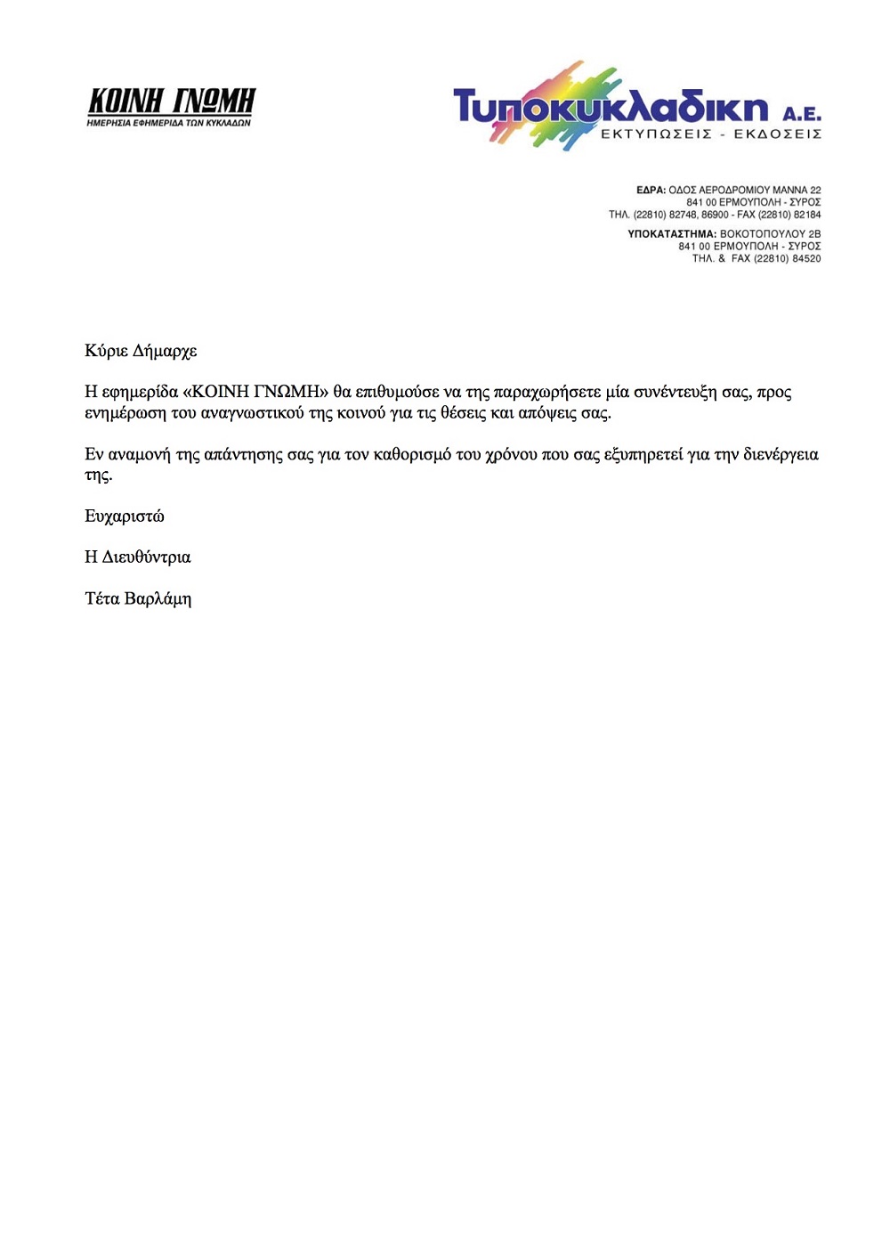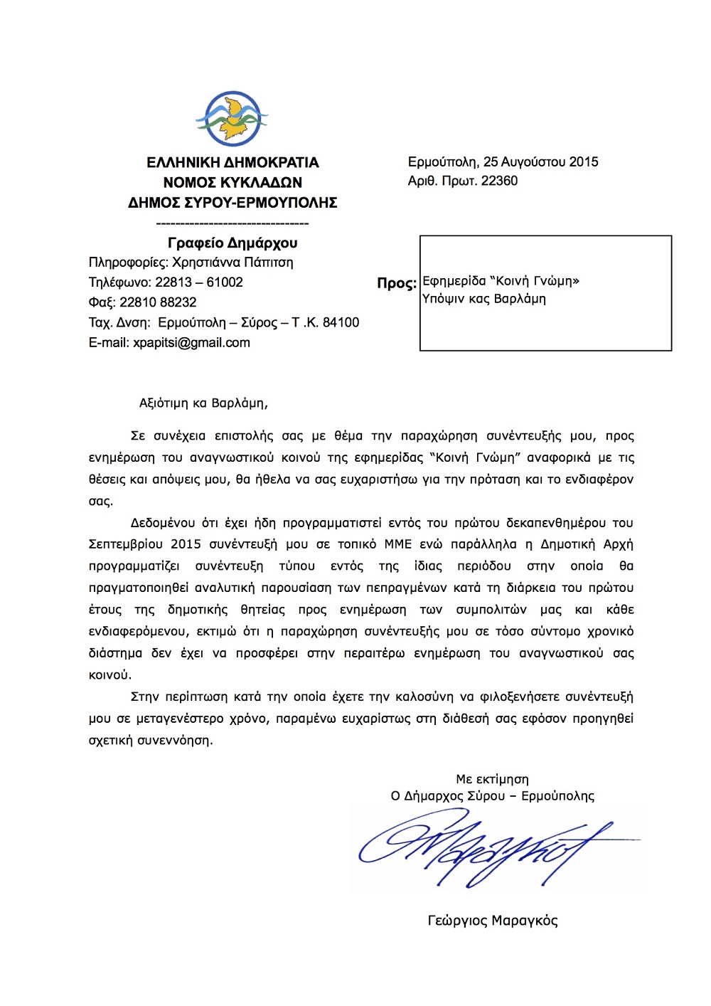 Σε κάθε προσπάθεια πολέμιων τακτικών εκ μέρους του Δημάρχου προς τον δημοσιογραφικό λόγο, τον αφήνουμε στην προσφιλή του ενασχόληση με την άσκηση της πολιτικής του ηλεκτρονικού καφενείου στην οποία αρέσκεται, όπως και της επιλογής του να προβάλλεται μόνο στα φίλια προς αυτόν Μέσα Ενημέρωσης.