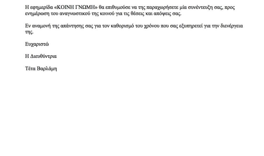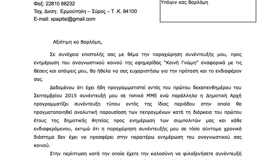 Και προκαταλαμβάνοντας δε τους σχολιασμούς, που θα επιχειρήσουν να αποδώσουν την παρούσα κριτική των Δημαρχιακών επιλογών στην άρνηση του να παραχωρήσει συνέντευξη στην «Κοινή Γνώμη», ενημερώνουμε ότι η κίνηση αυτή ήταν ο πλέον πρόσφορος τρόπος επιβεβαίωσης της αποφυγής εκ μέρους του ενός δημοσίου διαλόγου.
