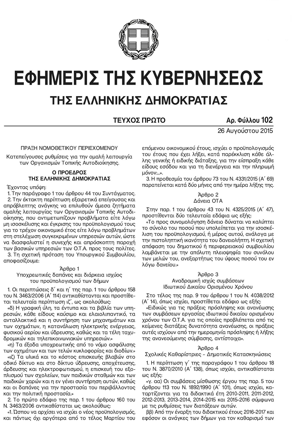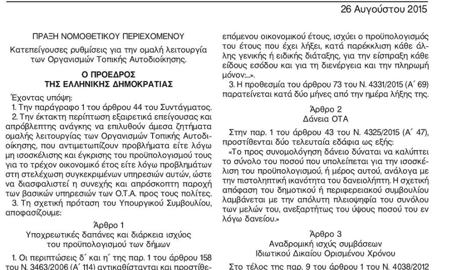 Όσον αφορά στα δάνεια ΟΤΑ, για τα οποία υπάρχει ειδική διάταξη στο νόμο για τον «Εκδημοκρατισμό της Διοίκησης, Καταπολέμηση της Γραφειοκρατίας και Ηλεκτρονική Διακυβέρνησης (Ν. 4325/2015), προστίθενται δύο τελευταία εδάφια ως εξής: «Το προς συνομολόγηση δάνειο δύναται να καλύπτει το σύνολο του ποσού που υπολείπεται για την ισοσκέλιση του προϋπολογισμού, ή μέρος αυτού, ανάλογα με την πιστοληπτική ικανότητα του δανειολήπτη. Η σχετική απόφαση του δημοτικού ή περιφερειακού συμβουλίου λαμβάνεται με την απόλυτη πλειοψηφία του συνόλου των μελών του, ανεξαρτήτως του ύψους ποσού του εν λόγω δανείου».