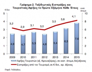 Από την άλλη πλευρά, οι ταξιδιωτικές εισπράξεις συνεχίζουν να αυξάνουν, με ελαφρώς χαμηλότερο ρυθμό, έναντι του 2014, καθώς αυξήθηκαν κατά 8,2% στο πρώτο εξάμηνο 2015, έναντι ανόδου κατά 9,6% στην αντίστοιχη χρονική περίοδο του 2014. Παρά την επιβράδυνση της αύξησης των τουριστικών εισπράξεων, διευκρινίζεται, ότι σε απόλυτο μέγεθος οι εισπράξεις από τον τουρισμό αυξήθηκαν στο υψηλότερο επίπεδο των τελευταίων ετών.