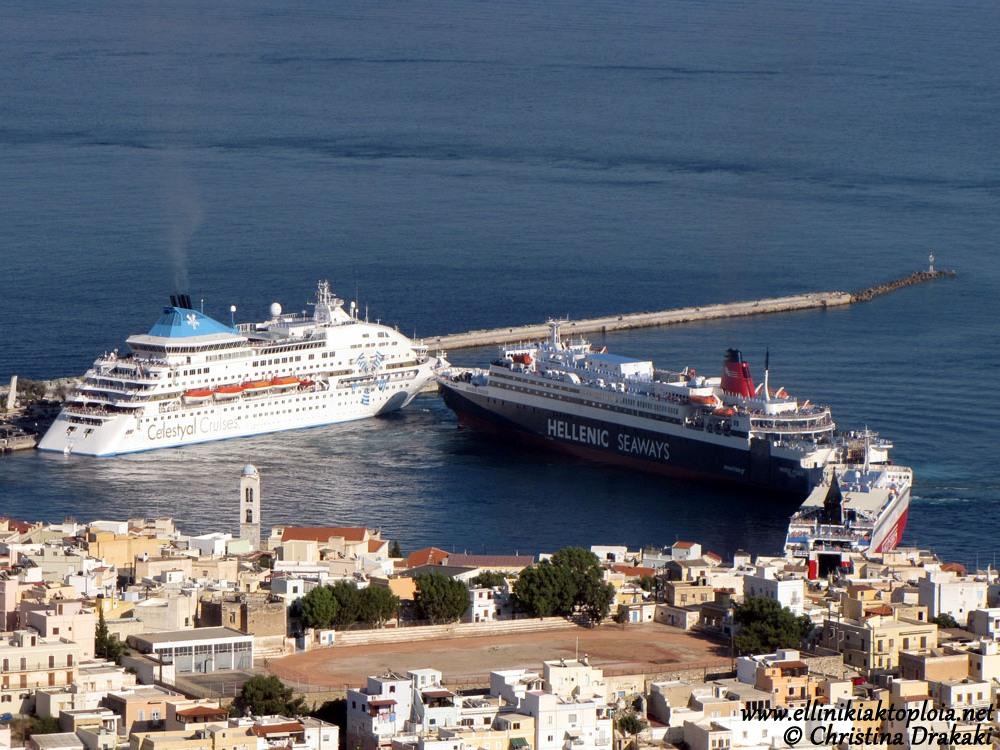 Κάθε απόγευμα Δευτέρας, όλο το καλοκαίρι, το λιμάνι της Σύρου φιλοξενεί το κρουαζιερόπλοιο CELESTYAL CRYSTAL, ένα πανέμορφο αρχοντικό σκαρί με εντελώς ιδιαίτερη πλώρη και όγκο που σου δίνει την εντύπωση πως γλιστράει προς τη θάλασσα για να μην κουράζει το μάτι αλλά αντιθέτως να του επιτρέπει να θαυμάσει όλες τις ναυπηγικές γραμμές του. Όταν δε φωτίζεται τα βράδια αποκτά υπόσταση “κλασσικής αρχιτεκτονικής” και συμμετέχει με λάμψη και αρχοντιά στην κλασσική ομορφιά της Ερμούπολης.
