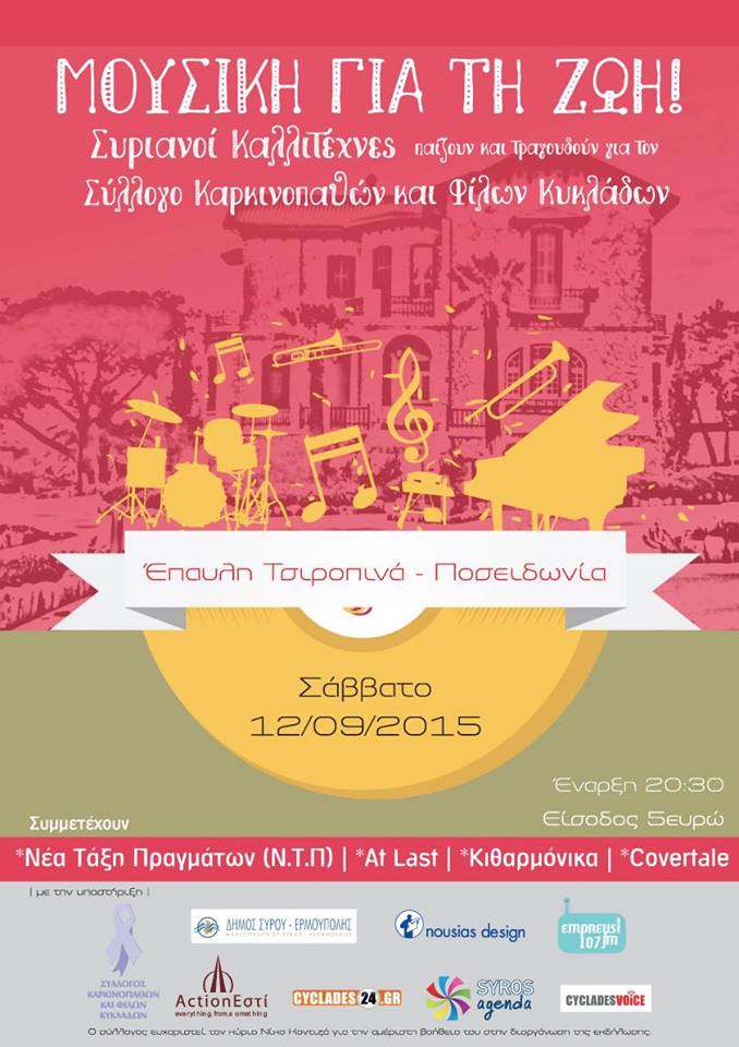 Η συναυλία «Μουσική για τη Ζωή» θα πραγματοποιηθεί με την υποστήριξη του Δήμου Σύρου – Ερμούπολης το Σάββατο 12 Σεπτεμβρίου και ώρα 20:30 στην Έπαυλη Τσιροπινά. Είσοδος: 5 ευρώ