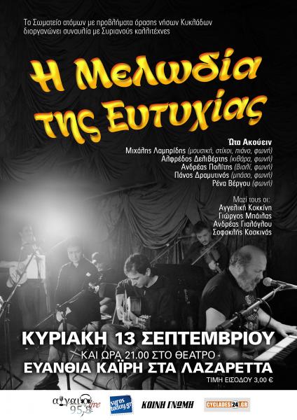 Η συναυλία «Η Μελωδία της Ευτυχίας» θα πραγματοποιηθεί την Κυριακή 13 Σεπτεμβρίου στο Θέατρο Ευανθία Καΐρη στα Λαζαρέττα με τη συμμετοχή Συριανών καλλιτεχνών.