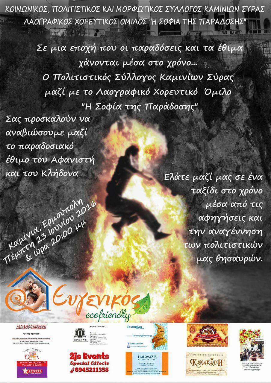 Σε μια εποχή που οι παραδόσεις και τα έθιμα χάνονται μέσα στο χρόνο, ο Κοινωνικός, Πολιτιστικός και Μορφωτικός Σύλλογος Καμινίων και ο Λαογραφικός – Χορευτικός Όμιλος «η σοφία της παράδοσης» αναβιώνουν μαζί το παραδοσιακό έθιμο του Αφανιστή και του Κλήδονα.