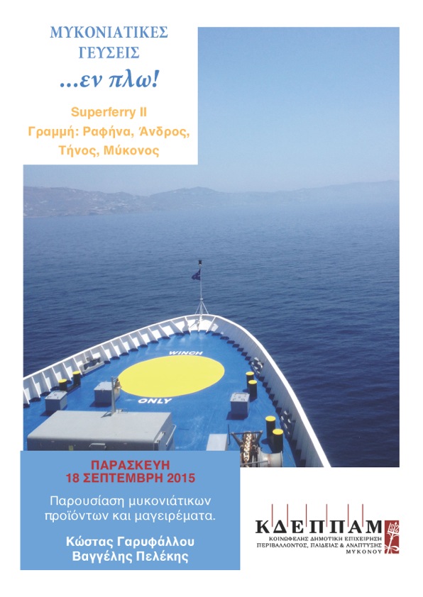 Η Δημοτική Κοινωφελής Επιχείρηση ΚΔΕΠΠΑΜ, στο πλαίσιο του αναπτυξιακού της ρόλου, οργανώνει σειρά εκδηλώσεων στο σαλόνι του Ε/Γ-Ο/Γ Superferry II, όπου θα παρουσιάζονται μυκονιάτικα προϊόντα διατροφής.