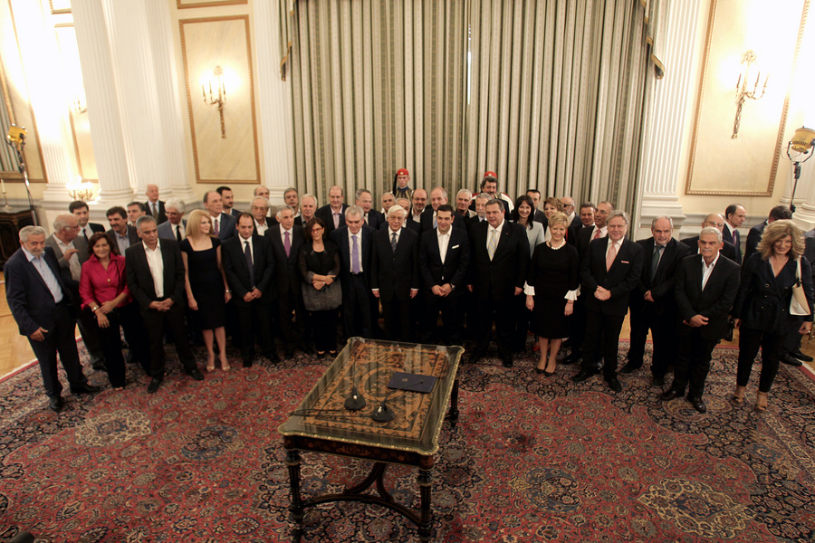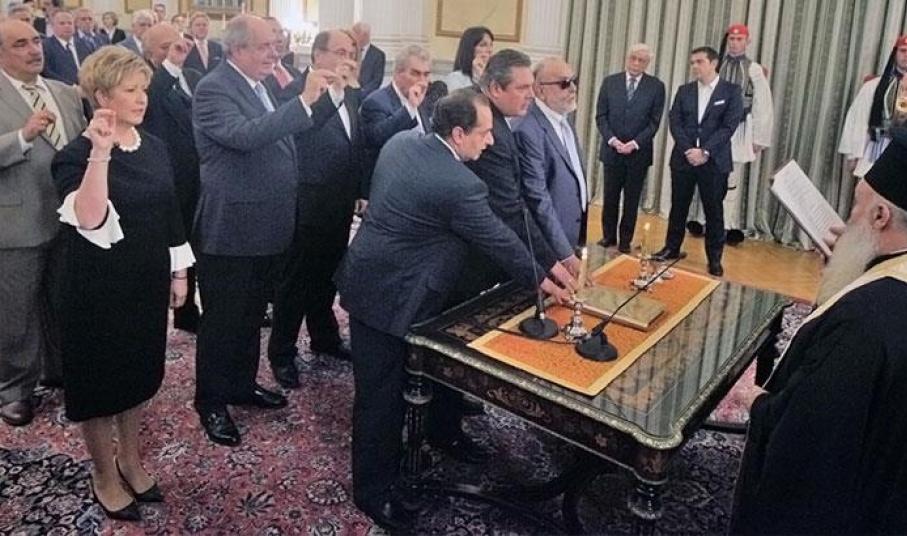 Τα μέλη της νέας κυβέρνησης ορκίστηκαν στο προεδρικό Μέγαρο, παρουσία του Προέδρου της Δημοκρατίας, Προκόπη Παυλόπουλου, από τον επίσκοπο Μεθώνης κ. Κλήμη.