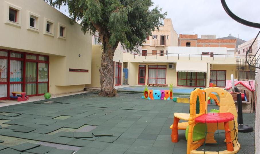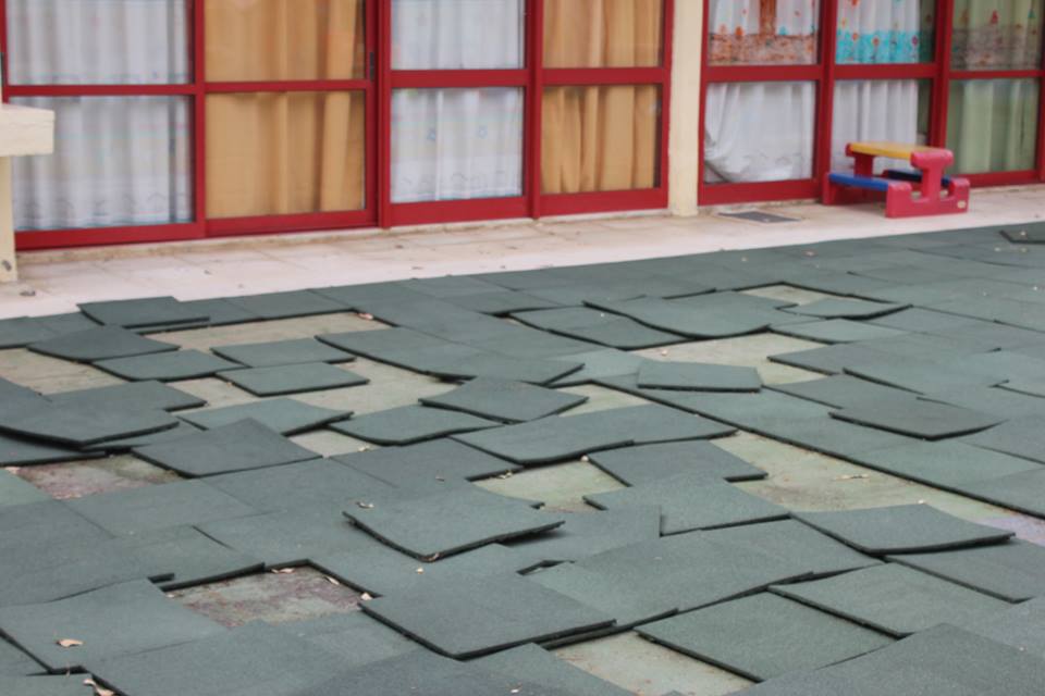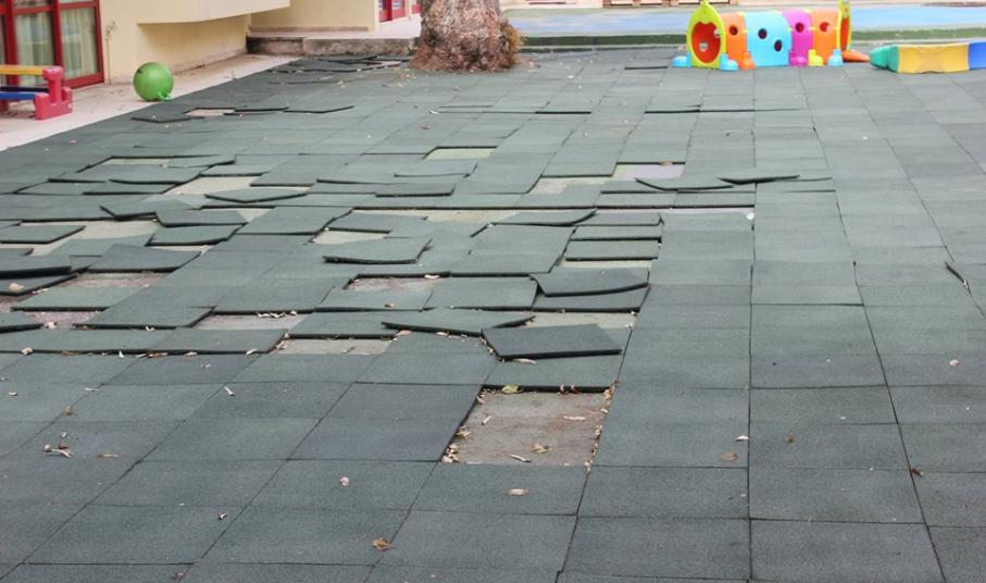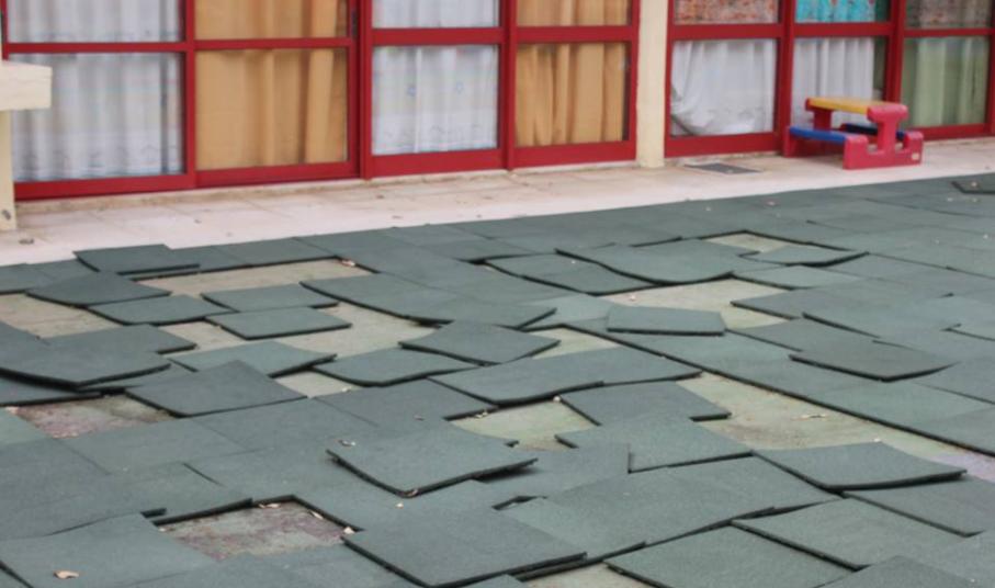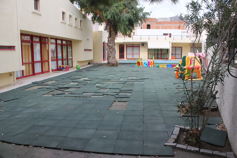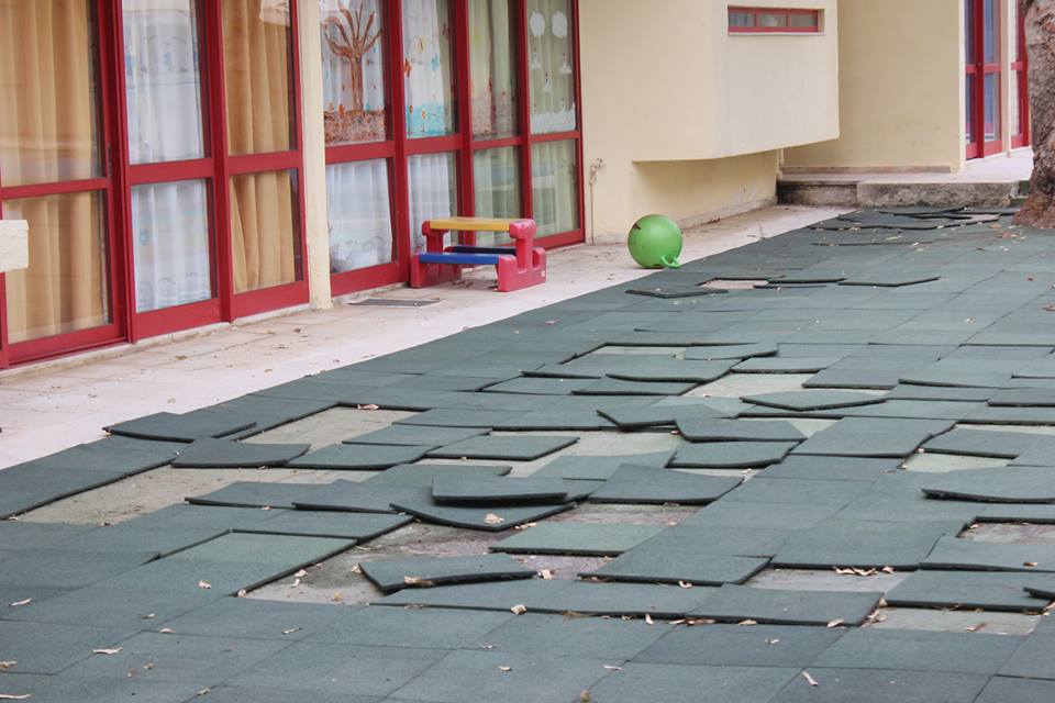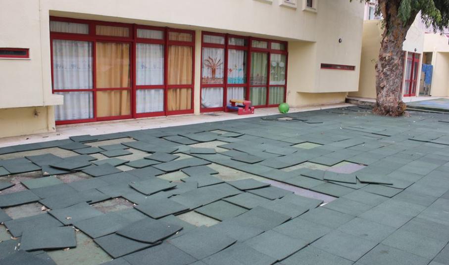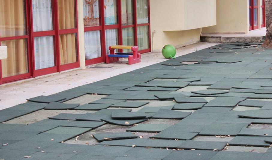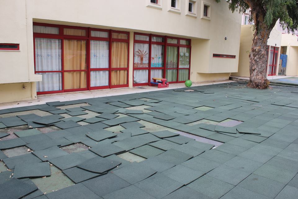 Οι μικρές ανομοιομορφίες του προαύλιου χώρου του παιδικού σταθμού στην Ερμούπολη – πλησίον του 4ου Δημοτικού Σχολείου – αποτέλεσαν ως φαίνεται την αιτία να “σηκωθούν” τμήματα του καινούργιου δαπέδου που τοποθετήθηκε πρόσφατα, προκειμένου να παίζουν με ασφάλεια τα μικρά παιδιά.