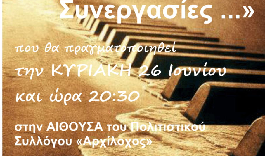 Την Κυριακή 26 Ιουνίου και ώρα 20:30 θα πραγματοποιηθεί η συναυλία του Δημοτικού Ωδείου Πάρου, με τίτλο «Μουσικές Συνεργασίες», στην αίθουσα του Πολιτιστικού Συλλόγου «Αρχίλοχος».