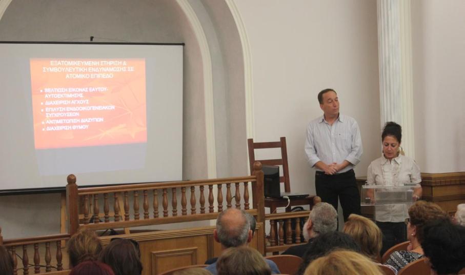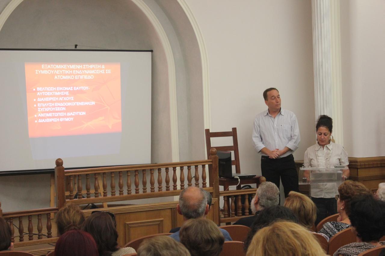Στο κομμάτι της συμβουλευτικής υποστήριξης αναφέρθηκε η ψυχολόγος τυ Κέντρου κ. Άννα Δαφνά. Όπως εξήγησε, στο πλαίσιο των ενεργειών συμβουλευτικής υποστήριξης και ενημέρωσης έλαβε χώρα εξατομικευμένη στήριξη και συμβουλευτική ενδυνάμωση σε ατομικό επίπεδο. Πιο συγκεκριμένα οι επωφελούμενες υποστηρίχτηκαν στη βελτίωση της εικόνας εαυτού και αυτοεκτίμησης, στη διαχείριση άγχους, στην επίλυση ενδοοικογενειακών συγκρούσεων και στην αντιμετώπιση διαζυγίων. Σε κάποιες περιπτώσεις μάλιστα έγιναν παραπομπές στο Κέντρο Υποστήριξης Κακοποιημένων Γυναικών που εδρεύει στη Σύρο. Επιπλέον υπήρξε υποστήριξη στη διαχείριση θυμού, στην αντιμετώπιση διαταραχών διάθεσης, όπως οι καταθλιπτικές και διπολικές διαταραχές, και αντιμετώπιση διαταραχών άγχους όπως η διαταραχή πανικού, η αγοραφοβία, οι φοβίες και η κοινωνική φοβία. Ωστόσο, τονίστηκε ότι σε 12 περιπτώσεις ωφελούμενων κρίθηκε αναγκαία η παραπομπή τους σε εξειδικευμένες δομές ψυχικής υγείας για περεταίρω ψυχολογική στήριξη.