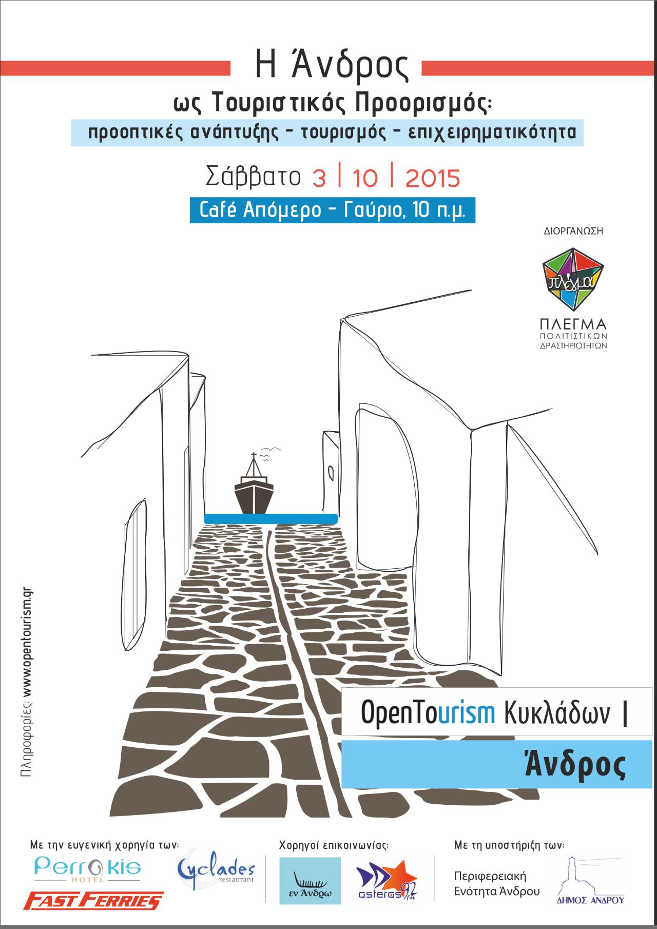 Στο πλαίσιο των εκδηλώσεων για τον εορτασμό της παγκόσμιας ημέρας τουρισμού διοργανώνεται στην Άνδρο το πρώτο OpenTourism Κυκλάδων, το οποίο θα λάβει χώρα το Σάββατο 3 Οκτωβρίου στις 10 π.μ. στο café Απόμερο, με ελεύθερη είσοδο.