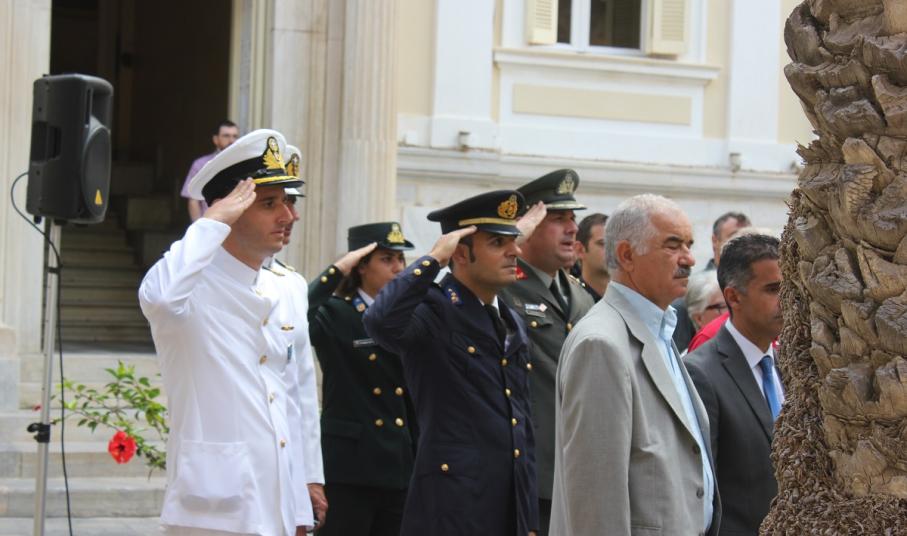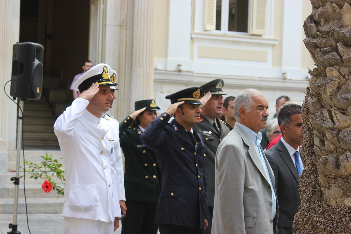 Μετά το πέρας της ομιλίας ακολούθησε επιμνημόσυνη δέηση στο εθνικό ηρώο στην πλατεία Τσιροπινά (προ της Περιφέρειας Ν. Αιγαίου) και κατάθεση στεφάνων. Οι εκδηλώσεις ολοκληρώθηκαν με σιγή ενός λεπτού και ανάκρουση του Εθνικού Ύμνου.