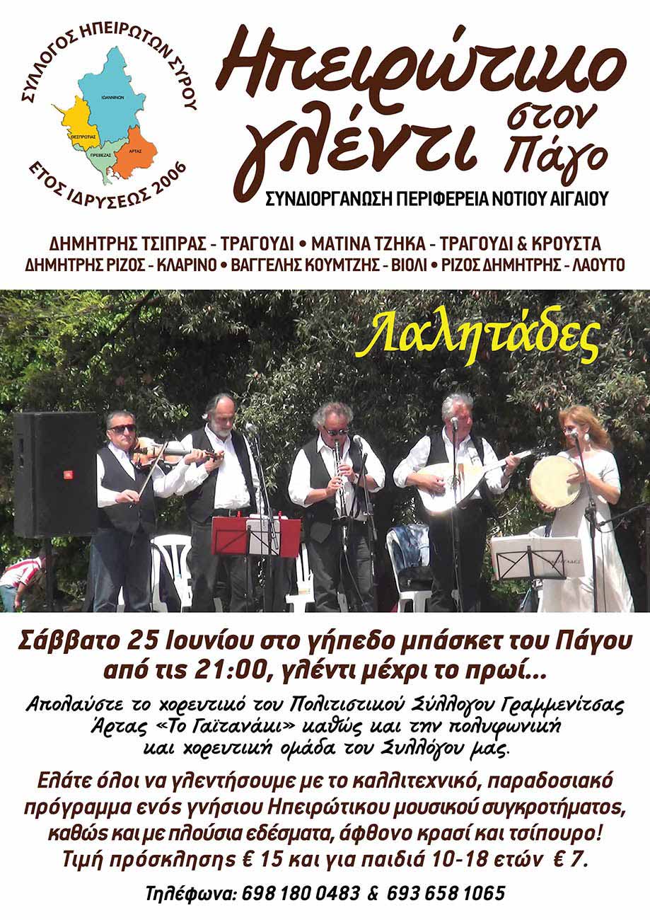 Ο Σύλλογος Ηπειρωτών Σύρου διοργανώνει, το Σάββατο 25 Ιουνίου 2016 και ώρα 21:00, το Ετήσιο Παραδοσιακό Ηπειρώτικο Πανηγύρι στο Γήπεδο Μπάσκετ του Πάγου.