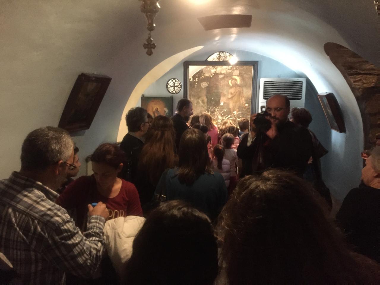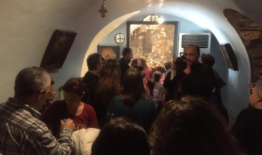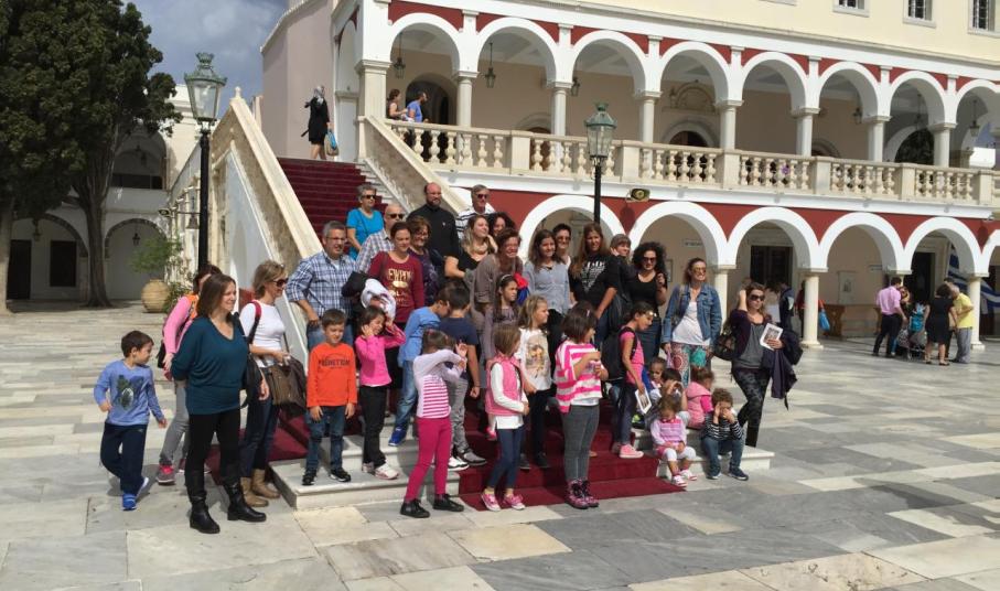 Ανταποκρινόμενοι στο κάλεσμα του εφημέριου π. Φλαβιανού Αλμπέσκου, γονείς και παιδιά, επισκέφτηκαν την Παναγία της Τήνου, όπου είχαν την ευκαιρία να ενημερωθούν από ιερέα του Ιδρύματος για το ιστορικό της εύρεσης της ιεράς εικόνας, μετά από σχετικά οράματα της μοναχής Αδελφής Πελαγίας. Μεταξύ άλλων, έγινε αναφορά και στις θαυματουργές ιδιότητες της εικόνας της Παναγίας. Σημειώνεται ότι εκείνη την περίοδο επικρατούσε ακόμη στο νησί ολέθρια πανώλη με κίνδυνο τη μετάδοση της θανατηφόρας ασθένειας σε όλο το νησί. Αλλά, ω του θαύματος, πολλοί από εκείνους που είχαν προσβληθεί από την πανώλη σώθηκαν παράδοξα, επικαλούμενοι τη βοήθεια της Θεοτόκου.