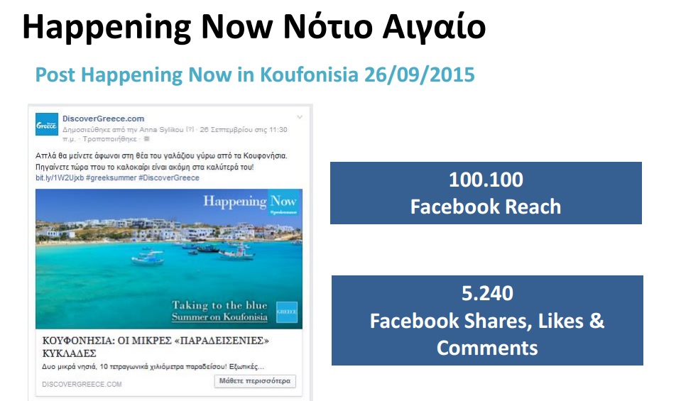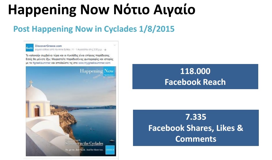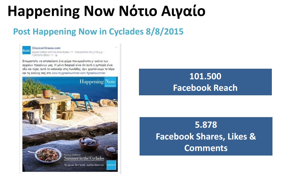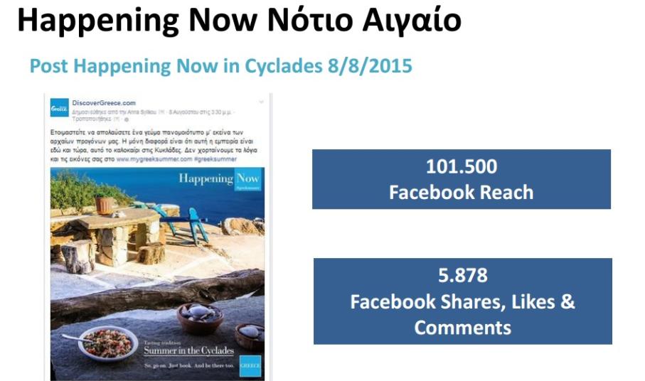 Ο νησιώτικος χώρος των Κυκλάδων κατέγραψε ως συνολική παρουσίαση 421.600 θεάσεις αλλά και 25.003 κοινοποιήσεις, like και σχόλια μέσω πέντε αναρτήσεων που υπήρξαν σε διαφορετικές ημερομηνίες εντός του διμήνου που διήρκησε η καμπάνια.