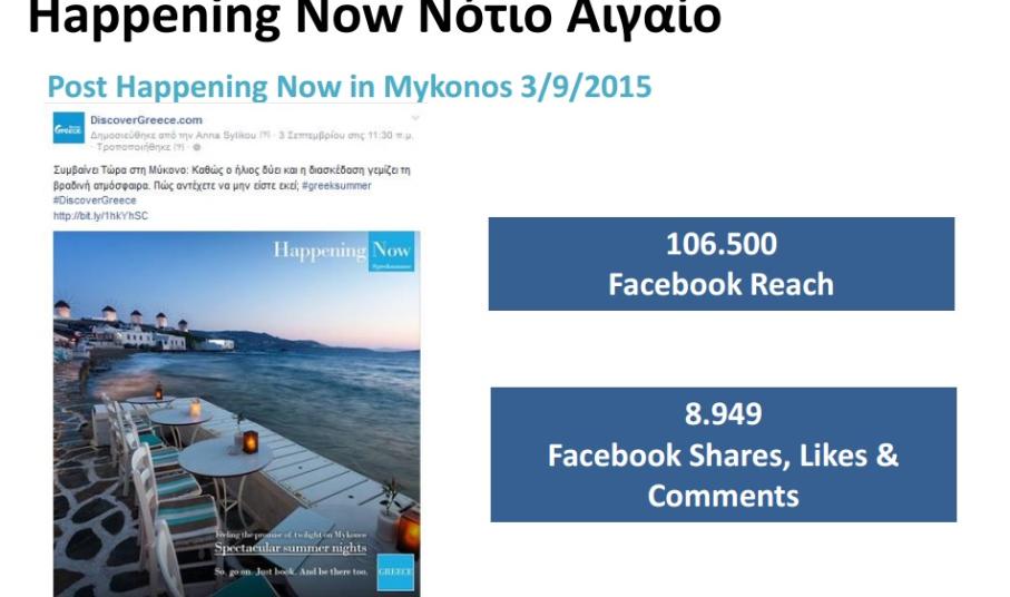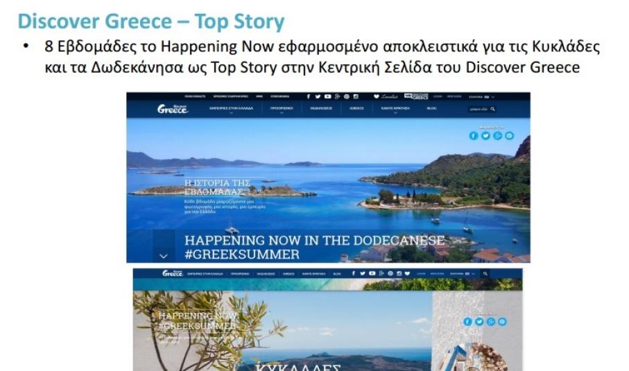 Αξίζει να επισημανθεί, πως, η καμπάνια επάνω στην οποία εξειδικεύθηκε η αντίστοιχη για το Νότιο Αιγαίου φέρει τίτλο “Happening Now in Greece” και αποτέλεσε πρωτοβουλία του Υπουργείου Τουρισμού και του ΕΟΤ, με τη συνεργασία του ΣΕΤΕ και της εταιρείας μη κερδοσκοπικού χαρακτήρα “Marketing Greece”, στόχος της οποίας ήταν να προσελκύσει τα βλέμματα του εισερχόμενου τουρισμού από Μ. Βρετανία, Γερμανία, Ιταλία, Γαλλία και Σκανδιναβικές χώρες.