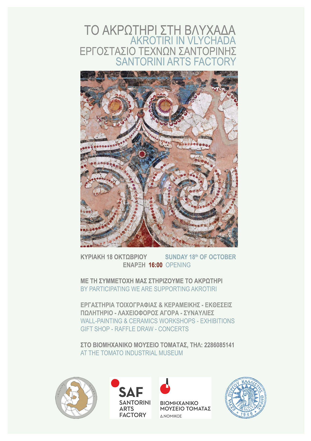 Το Εργοστάσιο Τεχνών Σαντορίνης, σε συνεργασία με τον πολιτιστικό σύλλογο “Εστία Πύργου”, το “La Ponta” και υπό την αιγίδα του Δήμου Θήρας, διοργανώνει την Κυριακή 18 Οκτωβρίου μια ημερίδα για την προβολή των Ανασκαφών Ακρωτηρίου Θήρας με τη συνέργεια της Εταιρείας Στήριξης Σπουδών Προϊστορικής Θήρας