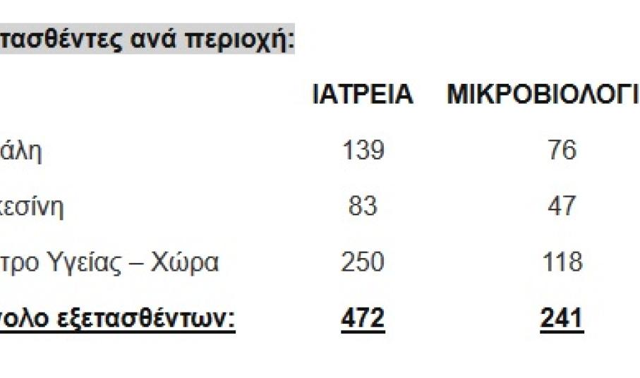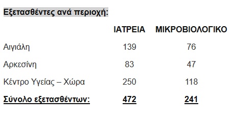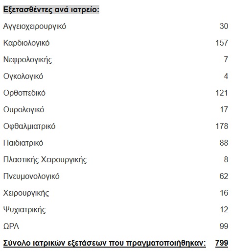 Το σύνολο των εξετασθέντων στο μικροβιολογικό ιατρείο, ανήλθε σε 241 άτομα, ενώ το σύνολο των ιατρικών εξετάσεων που πραγματοποιήθηκαν, ήταν 799.