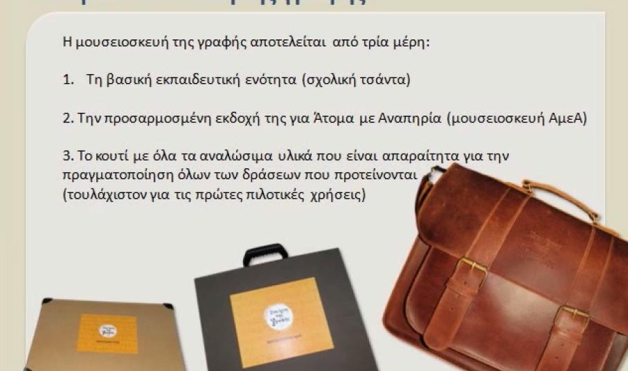 Συγκεκριμένα, πρόκειται για μια μικρή, φορητή, εκπαιδευτική έκθεση – δερμάτινη σχολική τσάντα η οποία περιέχει: 12 αντίγραφα ενεπίγραφων αντικειμένων και δυο σειρές καρτών για καθένας από αυτά, 9 επιπλέον αντικείμενα σχετικά με τη γραφή σε διάφορες χρονικές περιόδους, έντυπο με πληροφορίες για τα εκθέματα και προτάσεις για δραστηριότητες, ταμπλό επιτραπέζιου παιχνιδιού και οι αντίστοιχες κάρτες, φυλλάδια οδηγιών τόσο για τη μουσειοσκευή γενικά, όσο και για το παιχνίδι ειδικά, κουτί με αναλώσιμα υλικά για βιωματικά εργαστήρια με βάση τις προτεινόμενες δραστηριότητες για τις πρώτες πιλοτικές χρήσεις, κουτί με το υλικό της μουσειοσκευής απλοποιημένο και προσαρμοσμένο για ΑμεΑ και ιδιαίτερα για άτομα με προβλήματα όρασης.