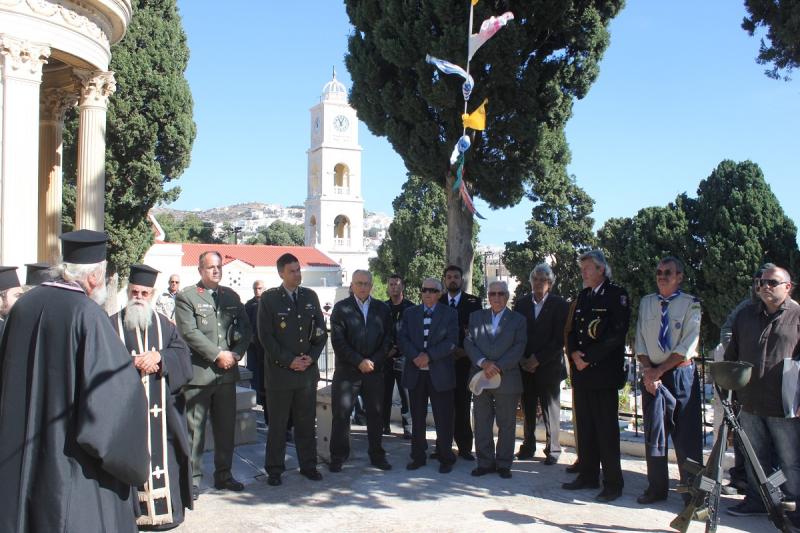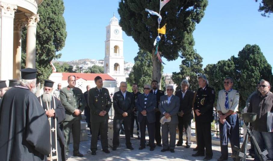 Λίγο αργότερα, τελέστηκε Επιμνημόσυνη Δέηση στο Κοιμητήριο του Ι.Ν. Αγίου Γεωργίου στην Ερμούπολη, παρουσία εκπροσώπων του στρατού και των σωμάτων ασφαλείας, της Ένωσης Αποστράτων Αξιωματικών Στρατού, του Σώματος Ελλήνων Προσκόπων και αντιπροσωπείας μαθητών του 6ου Δημοτικού Σχολείου Ερμούπολης. Εκκωφαντική η απουσία των πολιτικών αρχών του τόπου, η οποία γέννησε πλείστα όσα ερωτηματικά. Στη συνέχεια, αναγνώσθηκε προσκλητήριο νεκρών, ενώ ακολούθησε κατάθεση στεφάνων εκ μέρους του Ανώτερου Διοικητή Φρουράς Σύρου.