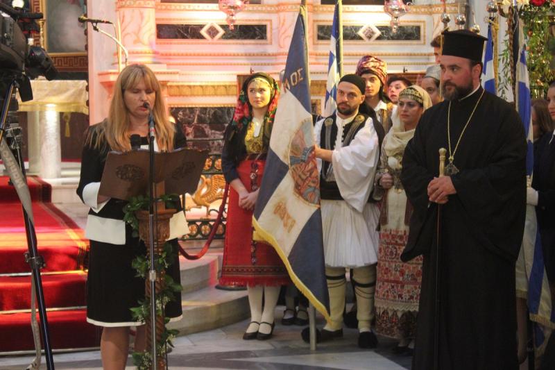 Μετά το πέρας της Δοξολογίας, εκφωνήθηκε ο Πανηγυρικός της Ημέρας από τη Διοικητική Υπάλληλο της Διεύθυνσης Πρωτοβάθμιας Εκπαίδευσης Κυκλάδων κ. Αναστασία Μπούρδου. Η ομιλήτρια αναφέρθηκε τόσο στον εθνικό, όσο και το θρησκευτικό χαρακτήρα της 28ης Οκτωβρίου, σημειώνοντας πως εκτός από το ιστορικό «ΟΧΙ» των Ελλήνων, εορτάζουμε και την Αγία Σκέπη, την Παναγία, που έστεκε, στέκει και πάντα θα στέκει προστάτιδα των Ελλήνων στους δίκαιους αγώνες τους για την ελευθερία. Υπογραμμίζοντας τη σημασία της Εθνικής Επετείου για ολόκληρο τον ελληνισμό, έκρινε πως ο λαός που λησμονεί την ιστορία του, είναι καταδικασμένος να την ξαναζήσει και μάλιστα τις μελανότερες σελίδες αυτής.