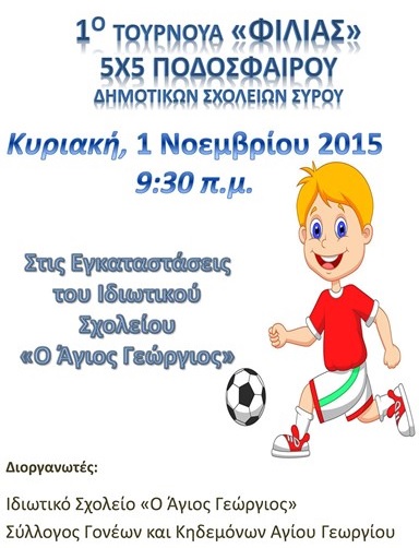 Τους καρπούς της ομαδικότητας και της ευγενούς άμιλλας μέσω του αθλητισμού θα γευτούν οι μαθητές της πρωτοβάθμιας εκπαίδευσης της Σύρου, συμμετέχοντας στο 1ο Τουρνουά «Φιλίας» 5x5 ποδοσφαίρου των Δημοτικών Σχολείων της Σύρου.