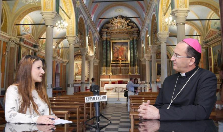 Εκφράζοντας την πεποίθηση πως η τοπική Εκκλησία οφείλει να συνεχίσει το πολύτιμο έργο της και να αγκαλιάζει πρωτίστως πνευματικά τους ανθρώπους κάθε ηλικίας, ο ίδιος, στη συνέντευξη που παραχώρησε στην “Κοινή Γνώμη” με αφορμή τους πρώτους μήνες της θητείας του από τη θέση του Επισκόπου μίλησε εφ΄ όλης της ύλης για το μεγάλο άνοιγμα της Εκκλησίας προς τον κόσμο μέσω των σύγχρονων ηλεκτρονικών εργαλείων επικοινωνίας, αλλά και μέσω του συνόλου των δράσεων της Καθολικής Επισκοπής. Μεταξύ άλλων, αναφέρθηκε δε και στη σημασία ανάδειξης της σπουδαίας ιστορικής κληρονομιάς της Καθολικής Εκκλησίας στη Σύρο, μέσω της προβολής του ανακαινισμένου Καθεδρικού Ναού του Αγίου Γεωργίου στην Άνω Σύρο και όχι μόνον, πραγματοποιώντας παράλληλα, ιδιαίτερη μνεία στη λειτουργία του Κέντρου Ιστορικών Μελετών της Καθολικής Επισκοπής αλλά και στην αξιόλογη και πλούσια σε περιεχόμενο μόνιμη έκθεση του Ιστορικού Αρχείου της τοπικής Εκκλησίας.