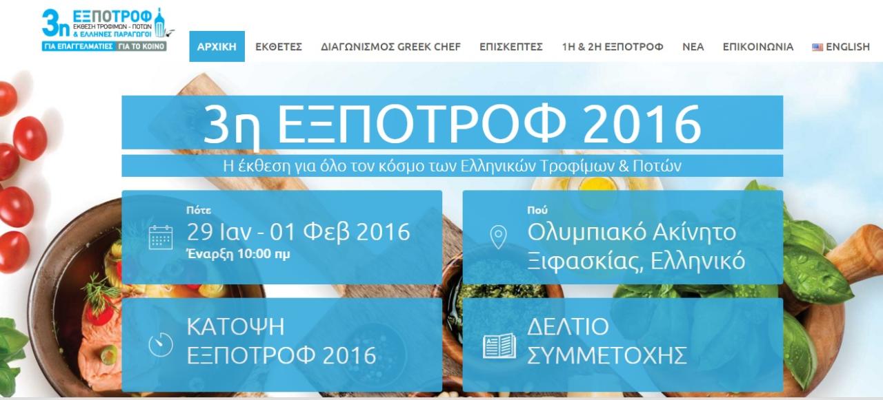 Επιπλέον, για πρώτη φορά, συμμετέχοντες και επισκέπτες θα έχουν την ευκαιρία να παρακολουθήσουν από κοντά τον 1ο Διαγωνισμό Μαγειρικής με ελληνικά προϊόντα «Greek Chef – ΕΞΠΟΤΡΟΦ 2016» με συμμετοχές από όλη την Ελλάδα και κριτές τους πιο γνωστούς Έλληνες chef και δημοσιογράφους γαστρονομίας.