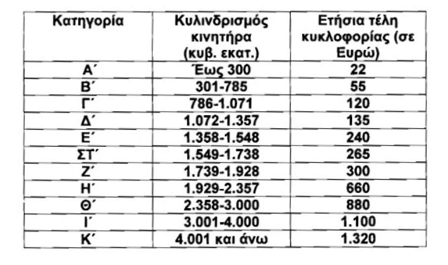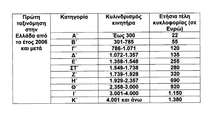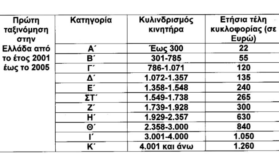 Πιο συγκεκριμένα, με την τροποποίηση του νόμου για τα τέλη κυκλοφορίας, στα επιβατικά αυτοκίνητα και τις δίκυκλες και τρίκυκλες μοτοσυκλέτες που έχουν ταξινομηθεί για πρώτη φορά στην Ελλάδα έως την 31-10-2010, θεσπίζονται τρεις κατηγορίες, για τις αντίστοιχες χρονικές περιόδους πρώτες ταξινόμησής τους, με βάση τον κυλινδριδμό του κινητήρα αυτών ως εξής: