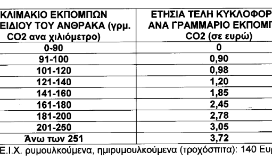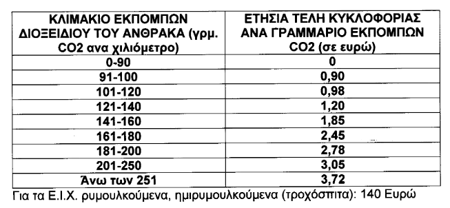 Στα αυτοκίνητα, τα οποία καταχωρήθηκαν στην Ελλάδα από την 1η Νοεμβρίου 2010 κι έπειτα, επιβάλλονται τέλη κυκλοφορίας βάσει των εκπομπών διοξειδίου του άνθρακα (γραμμάρια CO2 ανά χιλιόμετρο).