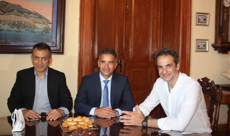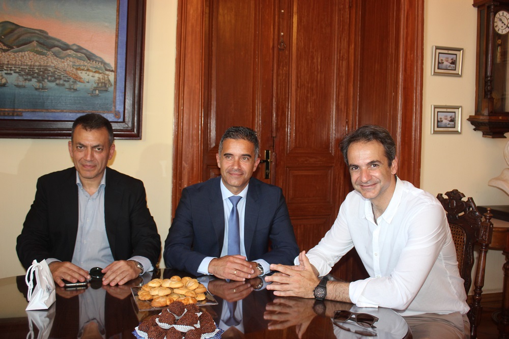 Στη συνέχεια, ο κ. Μητσοτάκης είχε επίσημη συνάντηση με τον δήμαρχο Σύρου – Ερμούπολης, Γιώργο Μαραγκό, τον οποίον κι επισκέφθηκε στο Δημαρχιακό Μέγαρο. Κατά τη διάρκεια της συζήτησής τους και όπως ανακοινώθηκε εκ των υστέρων από το γραφείο Τύπου, “ο δήμαρχος ενημέρωσε τον πρόεδρο της Αξιωματικής Αντιπολίτευσης διεξοδικά για τα προβλήματα που αντιμετωπίζουν τα νησιά και ιδιαίτερα η Σύρος. Πιο συγκεκριμένα ο κ. Μαραγκός, αναφέρθηκε στο θέμα της υψηλής φορολόγησης και της αύξησης των συντελεστών ΦΠΑ το οποίο αποτελεί ισχυρό πλήγμα και τροχοπέδη για την ανταγωνιστικότητα των νησιών, δεδομένου ότι ο τουρισμός” σύμφωνα με όσα πρόσθεσε, “αποτελεί τη βαριά βιομηχανία της χώρας μας”. Επίσης, ο κ. Μαραγκός προέβη σε ξεχωριστή αναφορά και σχετικά με το Νεώριο, που όπως σημείωσε, “αποτελεί οικονομικό πνεύμονα για τη Σύρο” ενώ μίλησε και για “τον αναπτυξιακό προγραμματισμό του Δήμου στους τομείς της διαχείρισης απορριμμάτων και του περιβάλλοντος, της τουριστικής ανάπτυξης, της προσέλκυσης επενδύσεων, στην αξιοποίηση πόρων από το ΕΣΠΑ και τα διαρθρωτικά ταμεία της ΕΕ”. Από την ατζέντα αναφοράς του δημάρχου, δεν έλειψε η μνεία και “στην αξιοποίηση του στρατοπέδου της Σύρου, στη δημιουργία τουριστικών υποδομών εντός του λιμένα της Ερμούπολης και στην ανάδειξη της Σύρου, με γνώμονα τα ιδιαίτερα χαρακτηριστικά της, ως τουριστικού προορισμού, καθ’ όλη τη διάρκεια του έτους”. Η συνάντηση ολοκληρώθηκε σε ευχάριστο κλίμα με την “αμοιβαία διαβεβαίωση για εποικοδομητική συνεργασία με γνώμονα την ευόδωση των προσπαθειών της Δημοτικής Αρχής”.