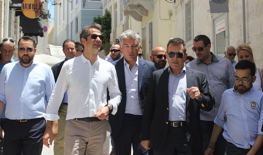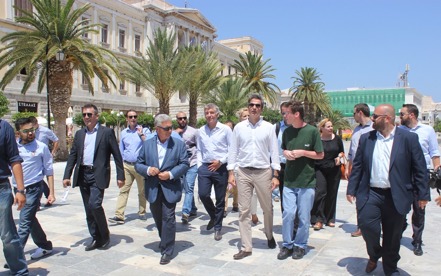 Πλαισιωμένος από κομματικά στελέχη της γαλάζιας παράταξης, τα οποία και του επεφύλαξαν θερμή υποδοχή στο λιμάνι της Ερμούπολης, καθώς επίσης και συνοδευόμενος από τον κοινοβουλευτικό εκπρόσωπο και βουλευτή Κυκλάδων της Νέας Δημοκρατίας, Γιάννη Βρούτση αλλά και τον πρόεδρο της ΝΟΔΕ Κυκλάδων, Κώστα Γαβιώτη πραγματοποίησε με συνέπεια τα προγραμματισμένα ραντεβού του συνομιλώντας με τους τοπικούς άρχοντες και εκπροσώπους φορέων.