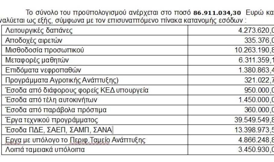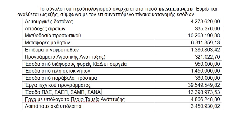 Αναλυτικότερα, το σύνολο του προϋπολογισμού της Περιφέρειας Νοτίου Αιγαίου ανέρχεται στο ποσό των 86.911.034,30 ευρώ. Στην εισήγηση προχώρησε ο πρόεδρος της Οικονομικής Επιτροπής, Φιλήμων Ζαννετίδης μετά από τις σχετικές αποφάσεις που έλαβαν τα μέλη του. Ειδικότερα, για την κάλυψη λειτουργικών δαπανών προβλέπεται το ποσό των 4.273.620 ευρώ, ενώ για αποδοχές αιρετών 335.376 ευρώ και για τη μισθοδοσία του προσωπικού 10.263.190,88 ευρώ. Σχετικά με το κομμάτι της μεταφοράς μαθητών έχουν προϋπολογισθεί περί τα 6.311.359,13 ευρώ, για τα επιδόματα νεφροπαθών 1.380.863,42 ευρώ και για τα προγράμματα αγροτικής ανάπτυξης 321.022,70 ευρώ. Σε επίπεδο εσόδων από διάφορους φορείς ΚΕΔ, υπουργεία έχει καταγραφεί το ποσό των 950.000 ευρώ, για έσοδα από τέλη αυτοκινήτων 1.450.000 ευρώ, καθώς επίσης για έσοδα από παράβολα πρόστιμα 360.000 ευρώ. Στον κατάλογο με τα αριθμητικά στοιχεία για τα έργα του τεχνικού προγράμματος έχουν προβλεφθεί 39.549.549 ευρώ ενώ για έσοδα ΠΔΕ-ΣΑΕΠ-ΣΑΜΠ-ΣΑΝΑ 13.398.973,53 ευρώ. Το ποσό των έργων με υπόλογο το Περιφερειακό Ταμείο Ανάπτυξης προϋπολογίζεται σε 4.866.248,80 ευρώ ενώ τα λοιπά ταμειακά διαθέσιμα προβλέπονται σε 3.450.930,02 ευρώ.
