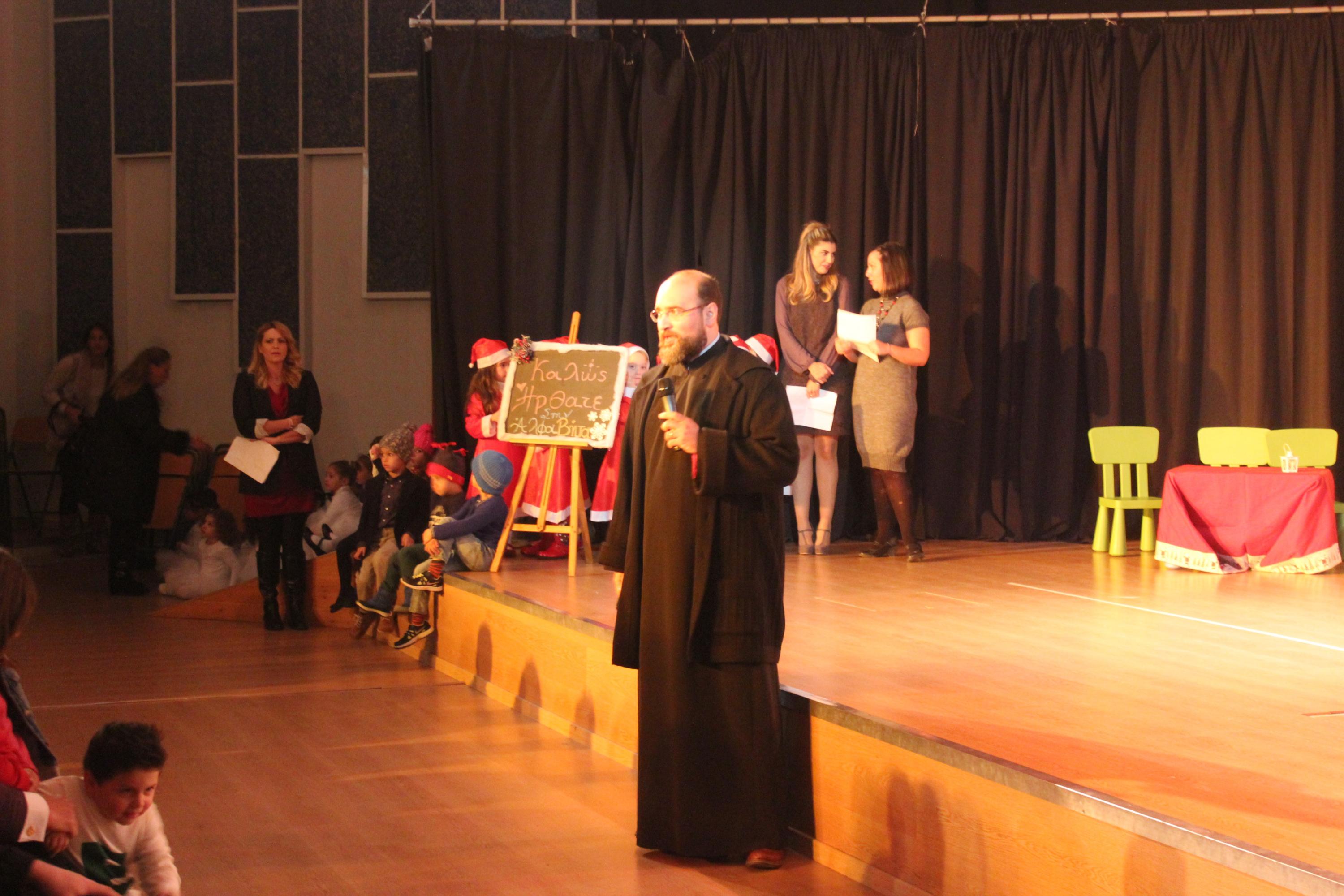 Σύντομο χαιρετισμό απηύθυνε, ο Διοικητικός Διευθυντής του Σχολείου π. Φλαβιανός Αλμπέσκου, ο οποίος απηύθυνε θερμές ευχαριστίες προς την εμπνεύστρια της Χριστουγεννιάτικης εκδήλωσης κ. Ανδριανή Παραβάλου, την κ. Ελένη Βουτσίνου για τη δραματοποίηση του έργου και τον κ. Παναγιώτη Βογιατζιδάκη για την επιμέλεια της μουσικής και την άψογη διαχείριση της ηλεκτρονικής σελίδας του Παιδικού Σταθμού.