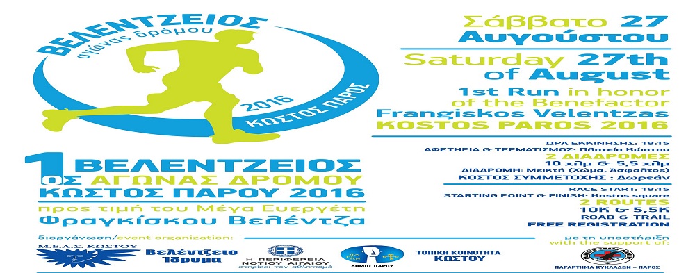 Ο ΜΕΑΣ Κώστου, το Βελέντζειο Ίδρυμα, η Περιφέρεια Νοτίου Αιγαίου, Ο Δήμος Πάρου και η Τοπική Κοινότητα Κώστου, διοργανώνουν τον 1ο Βελέντζειο Αγώνα Δρόμου προς τιμή του Μέγα Ευεργέτη της Πάρου Φραγκίσκου Βελέντζα. Ο αγώνας θα διεξαχθεί το Σάββατο 27 Αυγούστου, με αφετηρία και τερματισμό την πλατεία Κώστου. Ο δρόμος είναι μικτός καθώς περιλαμβάνει χώμα και άσφαλτο και οι αθλητές θα έχουν την ευκαιρία να δοκιμάσουν τις δυνάμεις τους. Θα υπάρξουν δύο διαδρομές των 9,9 χιλιομέτρων και 5,5 χλμ.