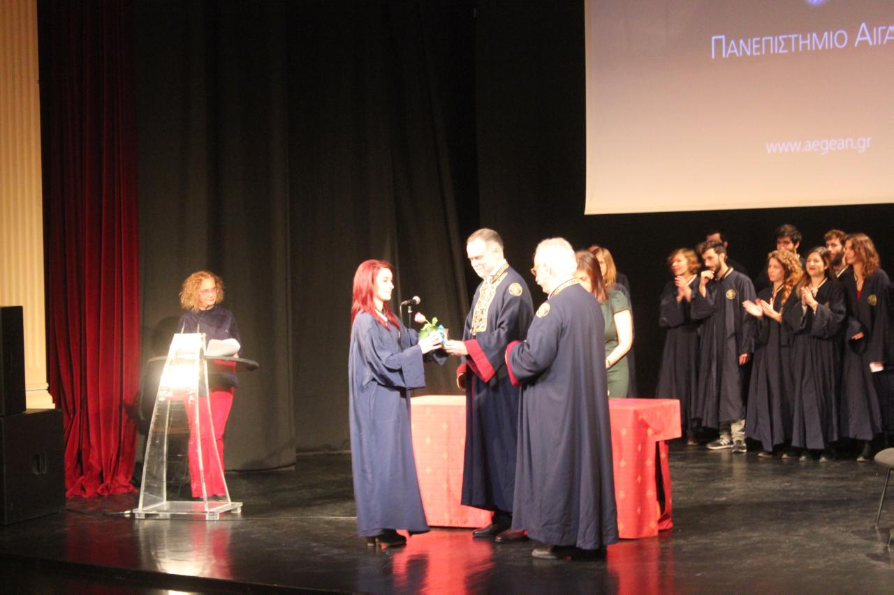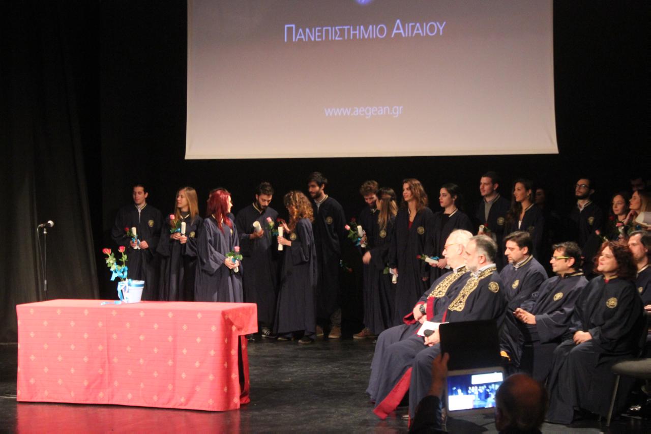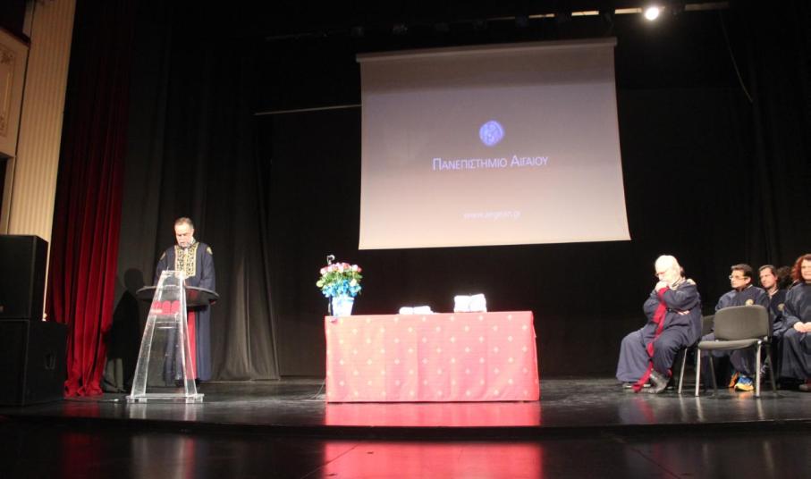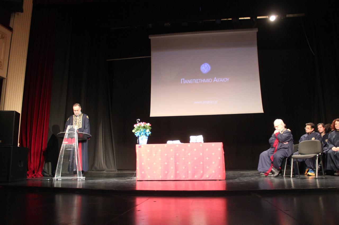 «Σήμερα, στεκόμαστε μπροστά σε μια νέα γενιά επιστημόνων, εδώ μακριά από τα συχνά απρόσωπα πανεπιστήμια των μεγάλων αστικών κέντρων, σε ένα νησιωτικό πανεπιστήμιο, που βιώνει καθημερινά πολλαπλές δυσκολίες, οι οποίες προκύπτουν από τη συνεχή μείωση της χρηματοδότησης και την εξ’ αυτής απορρέουσα αδυναμία να ενισχύσει περαιτέρω τις δομές φοιτητικές μέριμνας» ανέφερε χαρακτηριστικά, καθιστώντας ωστόσο σαφές ότι το Πανεπιστήμιο Αιγαίου αποτελεί απτό παράδειγμα δημόσιου εκπαιδευτικού ιδρύματος που σε πείσμα των δύσκολων καιρών συνεχίζει την αναπτυξιακή του πορεία.